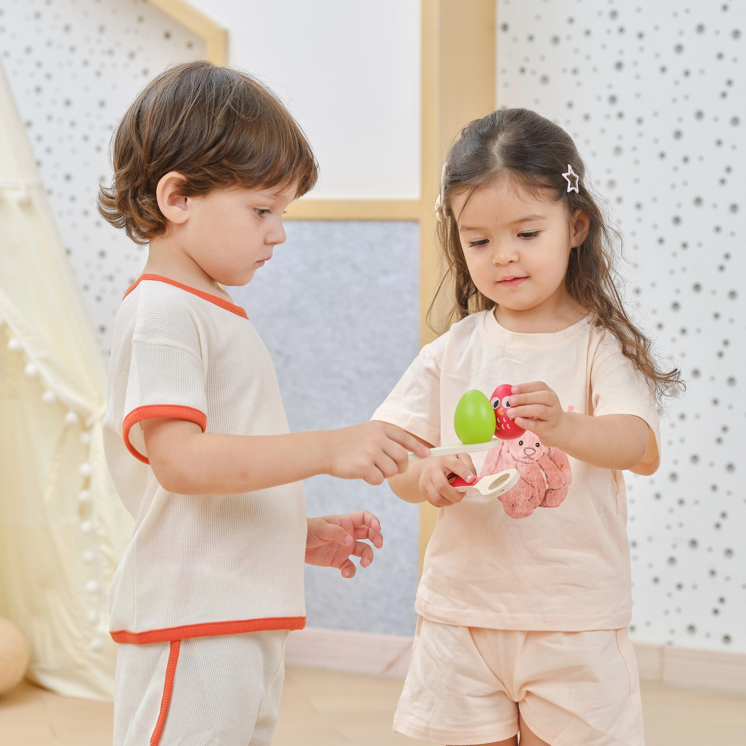 La madera lisa con toques de color y un mango cómodo facilitan el agarre y ayudan a los niños a concentrarse en el equilibrio del huevo.