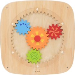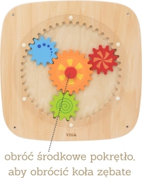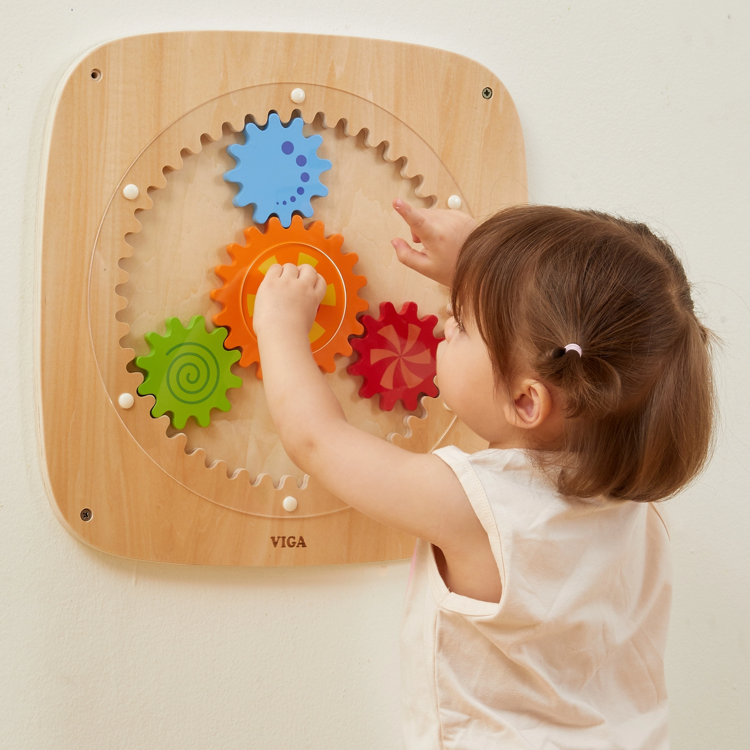 Este tablero mural de madera con engranajes de colores está diseñado para aportar a los niños la alegría del descubrimiento. Al girar la rueda central se ponen en marcha todos los engranajes a la vez, lo que muestra de forma natural a los niños el principio de fuerza, movimiento y relaciones causales. Los distintos colores y patrones de las ruedas generan atractivos efectos visuales al girar.