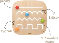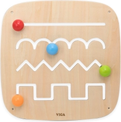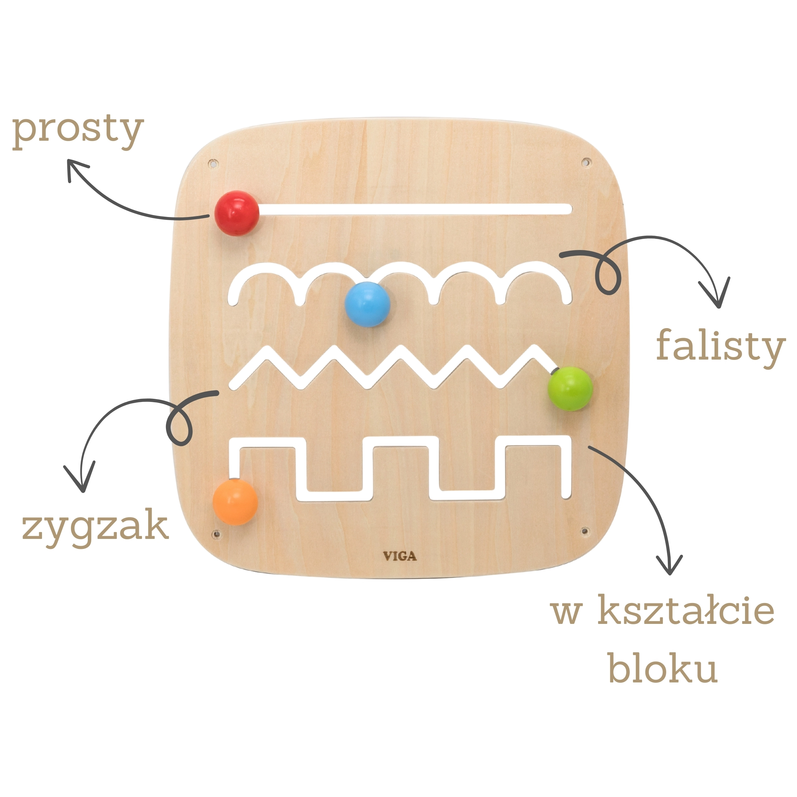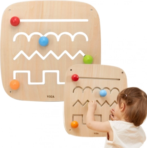 El tablero de madera VIGA convierte el juego diario en una actividad significativa. Los niños deslizan las bolitas por diferentes recorridos, exploran líneas rectas, ondas, zigzags y formas de bloques, entrenan el agarre, la precisión del movimiento y aprenden conceptos como curvas y ángulos. La madera natural, las esquinas redondeadas y la fijación robusta garantizan seguridad en cada contacto.