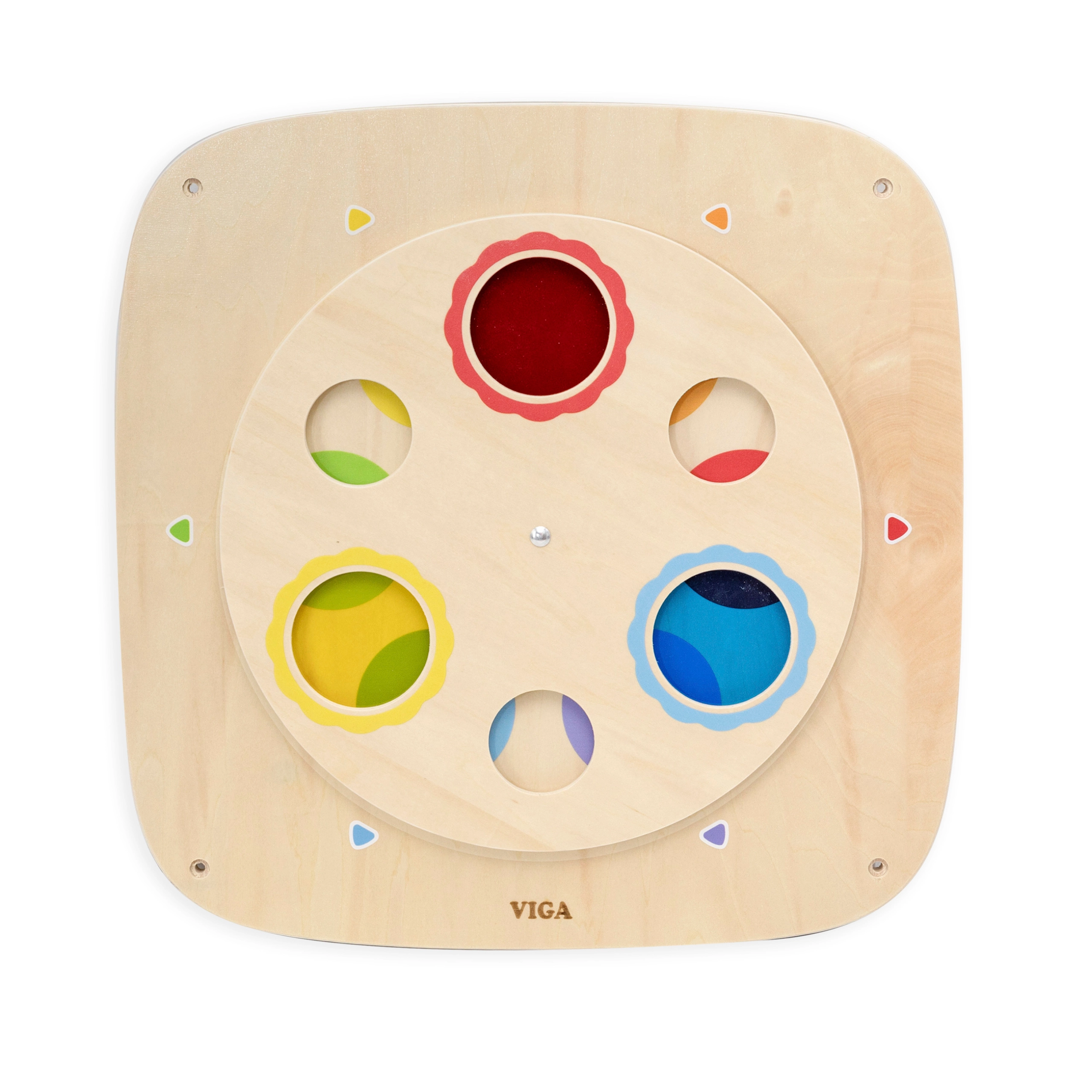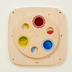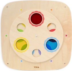 Este tablero sensorial de pared de madera VIGA de alta calidad acerca de forma lúdica el aprendizaje de la teoría del color. El panel circular giratorio con ventanillas transparentes de colores permite a los niños comparar colores, superponerlos y descubrir nuevos tonos. Gracias a su construcción robusta, el tablero es ideal para hogares, guarderías y zonas de juego.
