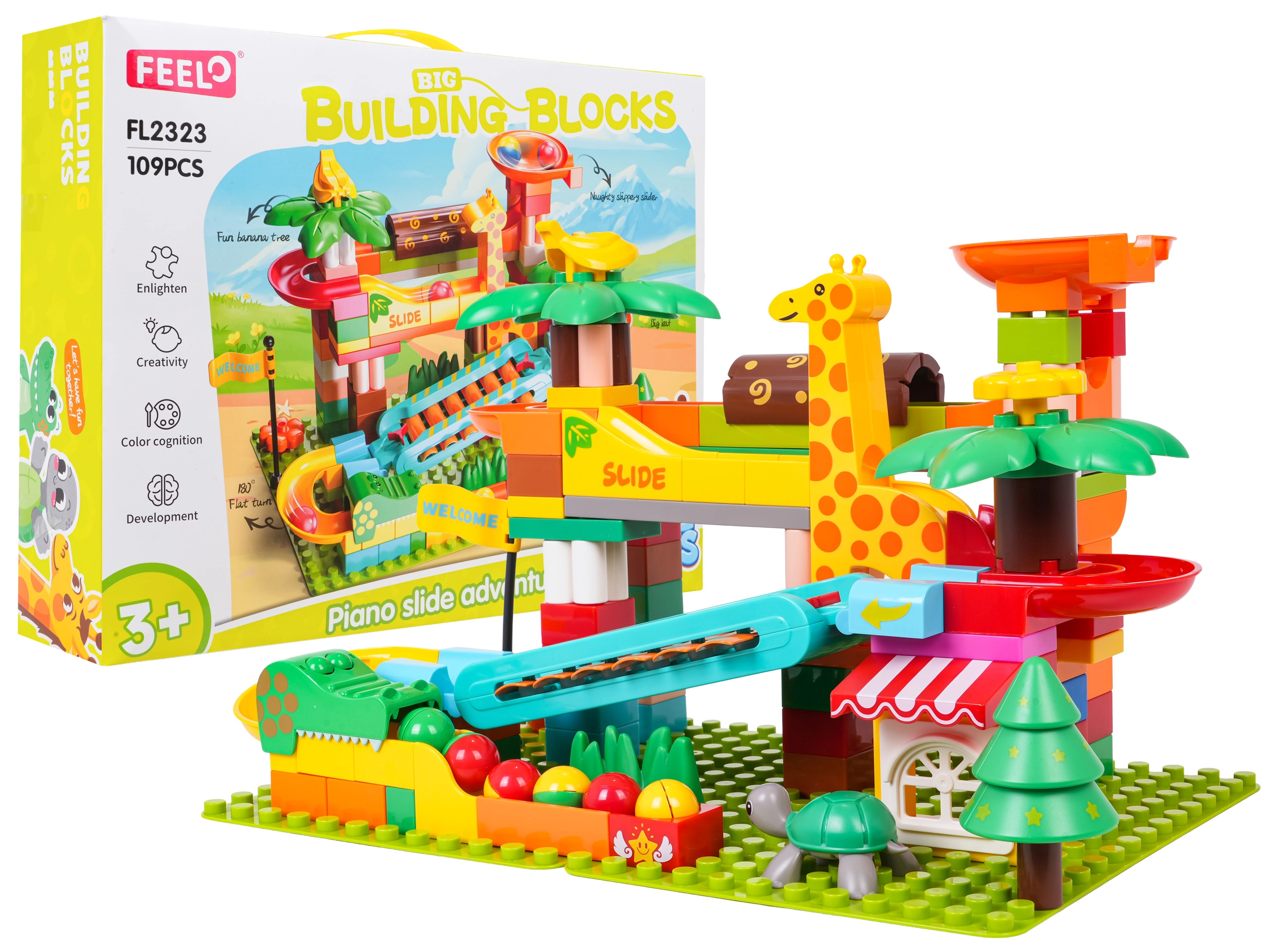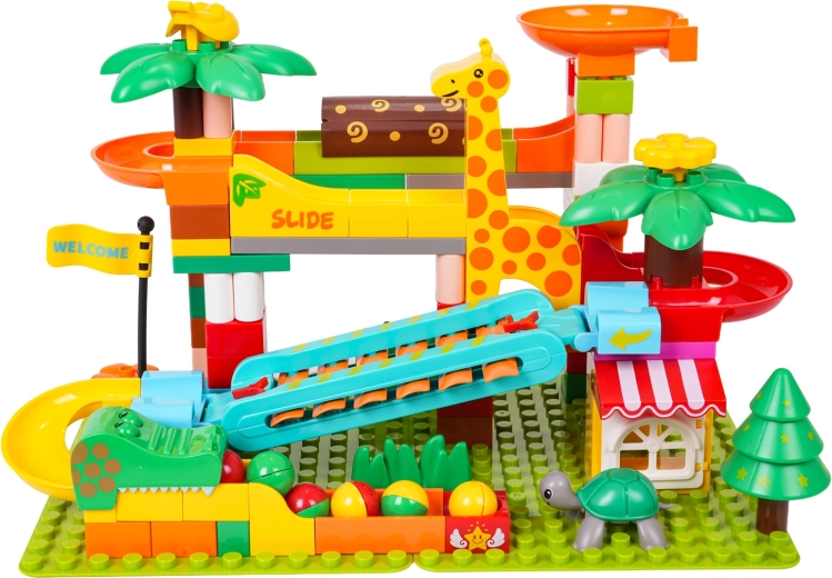 Este creativo juego de construcción lleva al cuarto infantil la atmósfera del safari: palmeras, animalitos y una casita se combinan con una ingeniosa pista de canicas con toboganes, embudos y un elemento tipo piano: cuando las canicas pasan por el carrillón, crean melodías alegres. La base estable y el sencillo encaje de las piezas aseguran una construcción y un juego agradables.