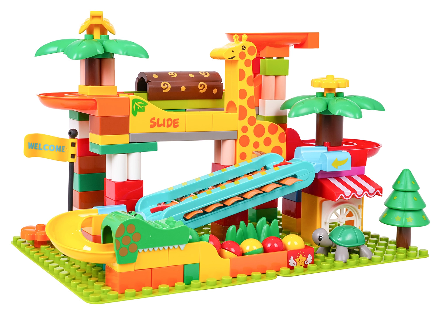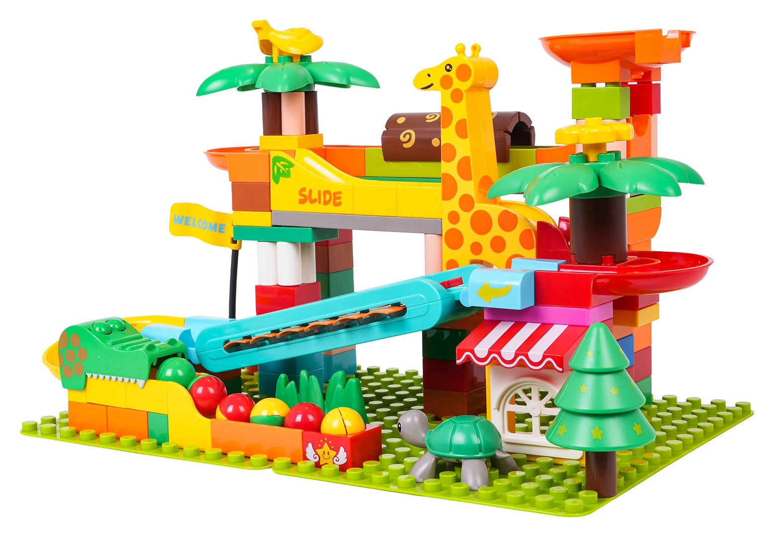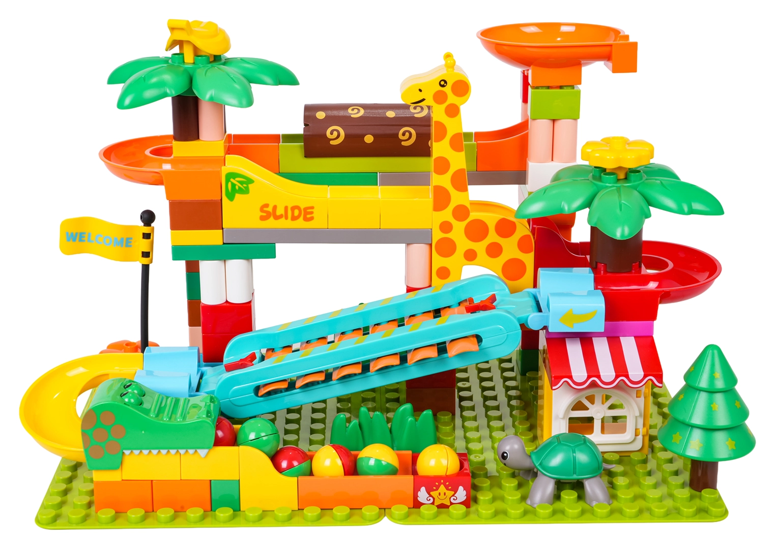 Ramps, embudos y toboganes de colores con decoraciones de palmeras y animalitos invitan a construir circuitos siempre nuevos.