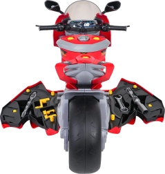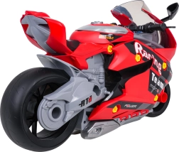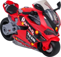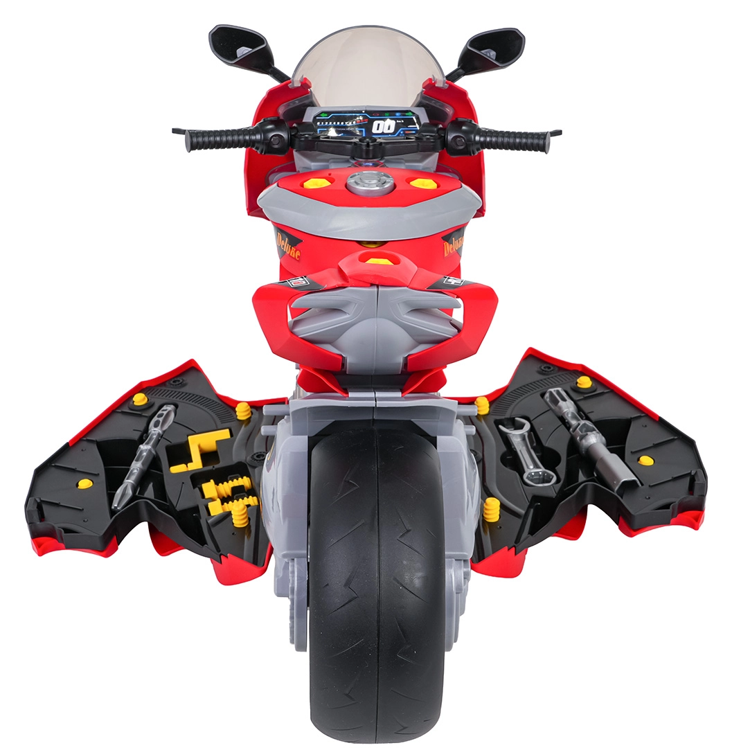 La motocicleta está fabricada con materiales de alta calidad y resistentes, cuenta con un asa cómoda para transportarla, ruedas grandes y móviles y detalles realistas de la carrocería. Los efectos incluyen faros delanteros, luces traseras, sonidos de motor y un singular efecto de humo en el escape tras añadir agua. Ideal como regalo para niños curiosos.