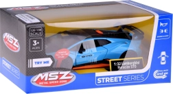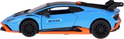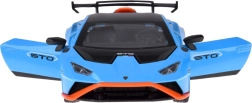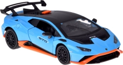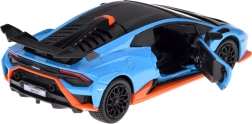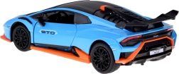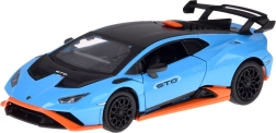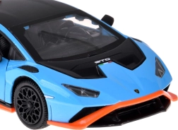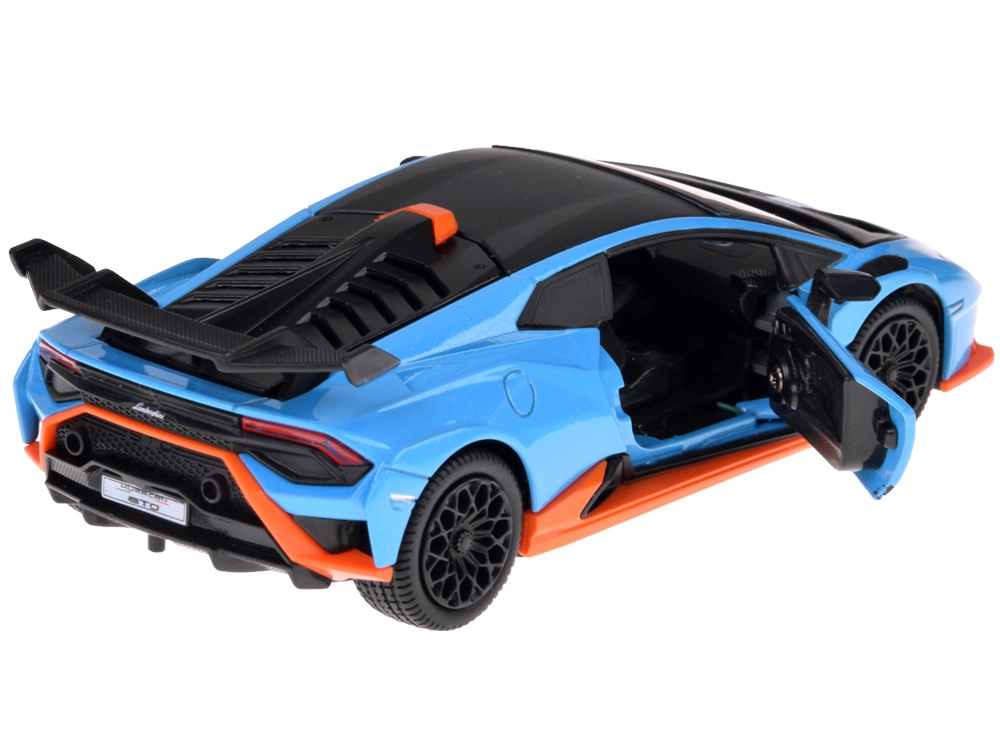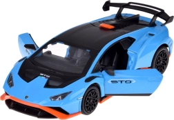 Este modelo detallado del LAMBORGHINI Huracán STO a escala 1:32 encantará tanto a niños como a adultos aficionados a los superdeportivos. Carrocería metálica en azul metalizado con acentos negros y naranjas, líneas fieles y gran alerón trasero que realzan su aspecto auténtico. Al abrir las puertas se activan los efectos de luz y sonido: se encienden las luces y suenan el motor y el claxon.