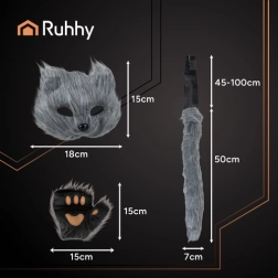 Exprésate al máximo con el set RUHHY 4 en 1. La combinación de máscara con goma, cola larga ajustable con alambre flexible y adorables patitas/guantes crea un disfraz universal para cosplay, convenciones, fiestas, videos y sesiones temáticas. El acabado en suave y agradable piel sintética es cómodo de llevar y tiene un aspecto realista.