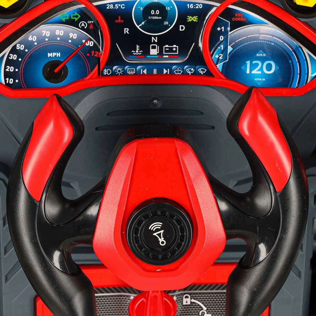Sonidos de motor y claxon, luces intermitentes, botón de arranque y luz de emergencia transforman la habitación infantil en un auténtico taller.