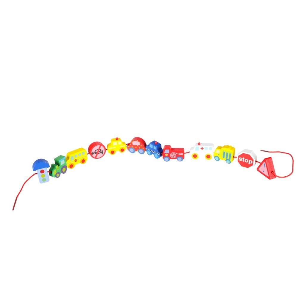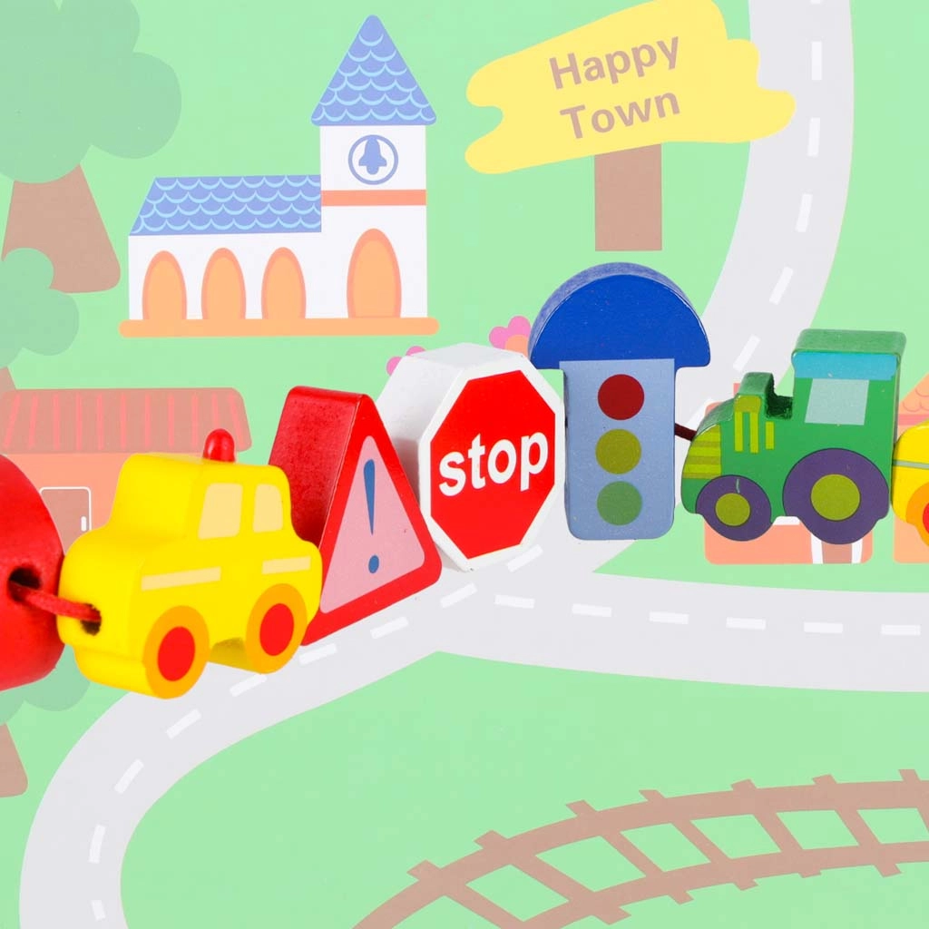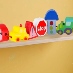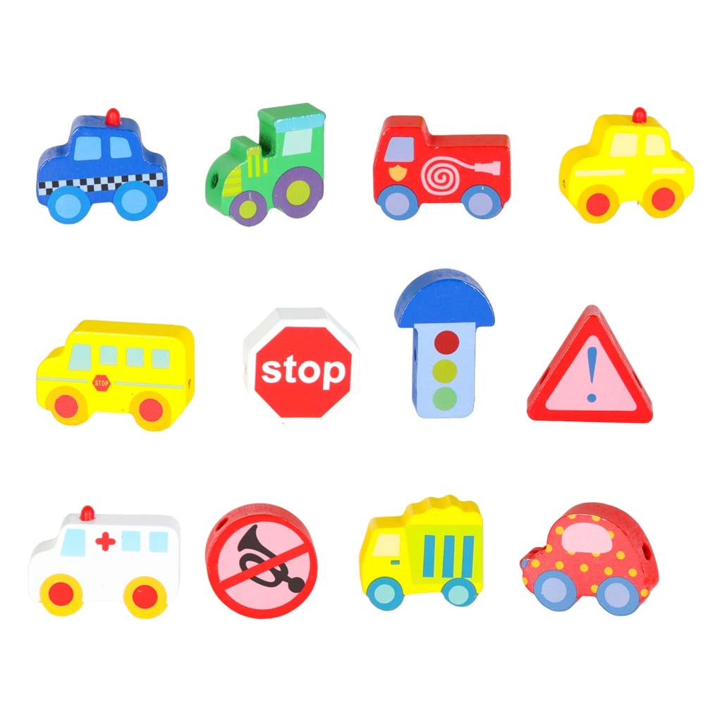 Bloques macizos y suavemente pulidos con forma de vehículos y señales, fáciles de agarrar y con orificios pasantes para ensartar cómodamente en el cordón.