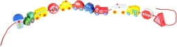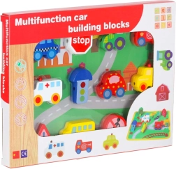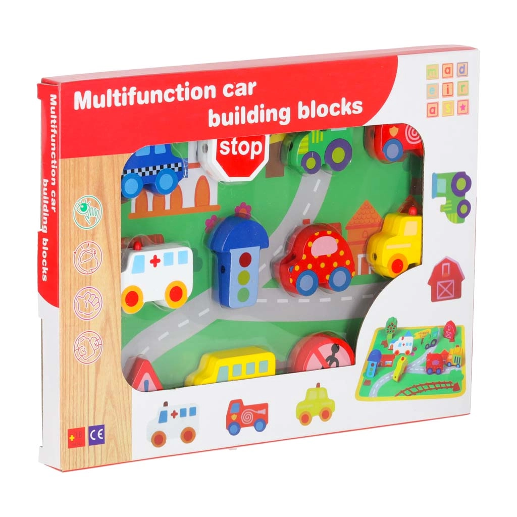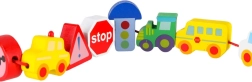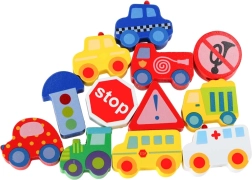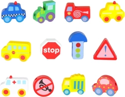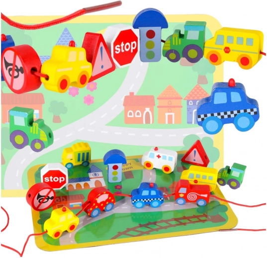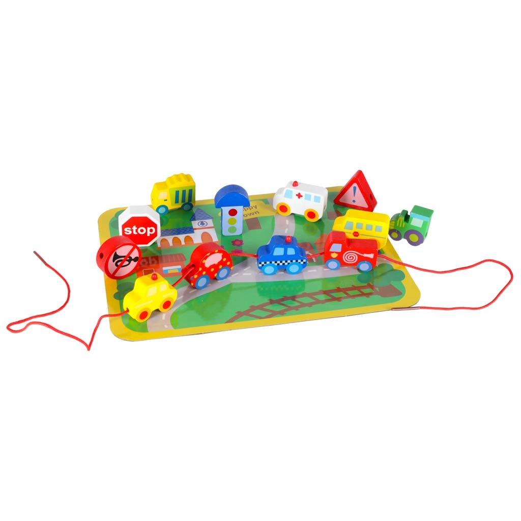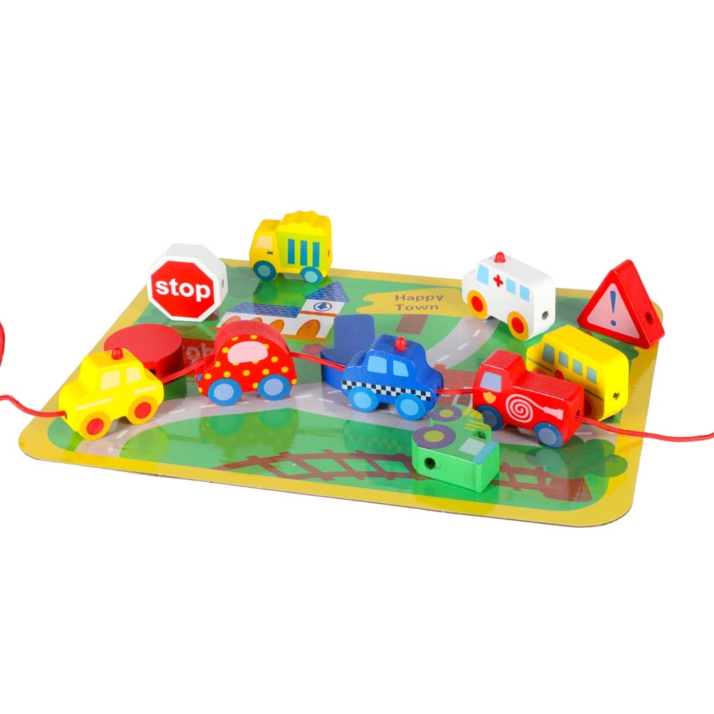 Bloques macizos y suavemente pulidos con forma de vehículos y señales, fáciles de agarrar y con orificios pasantes para ensartar cómodamente en el cordón.