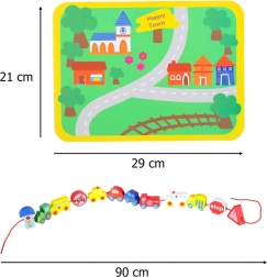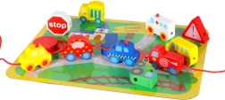 Este set creativo combina el ensartado de cuentas de madera con el juego libre en el tapete de “ciudad”. Los niños practican el agarre, la precisión de movimientos y la paciencia mientras conocen coches, ambulancia, autobús, policía y señales de tráfico. Las piezas están suavemente acabadas, son agradables al tacto y están coloreadas de forma segura.