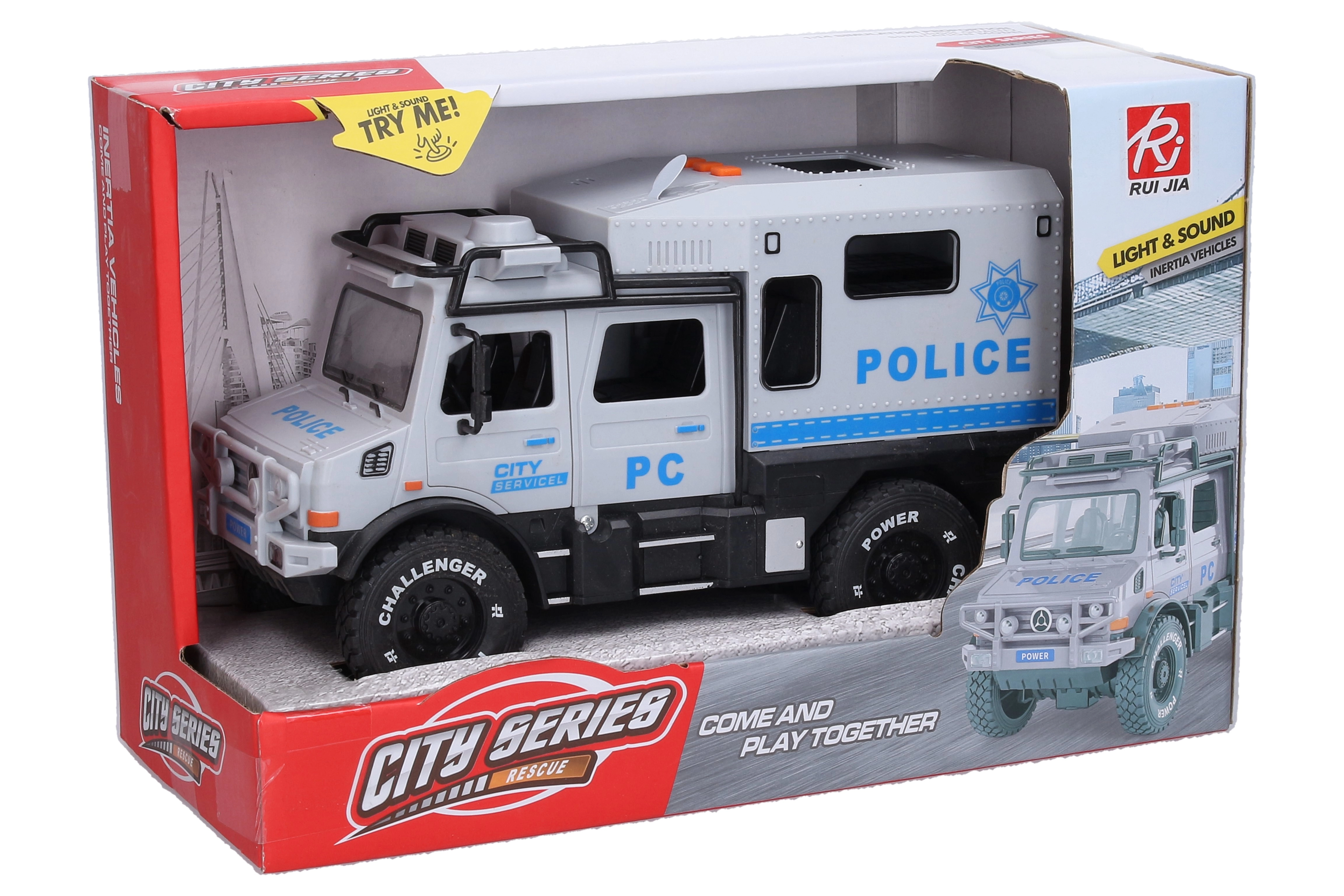 El realista coche blindado de policía de inercia encantará a los pequeños amantes de la acción. Ofrece efectos de luz y sonido, activación fácil con botones en el techo y un tamaño compacto de 24 cm para jugar cómodamente en casa y al aire libre.