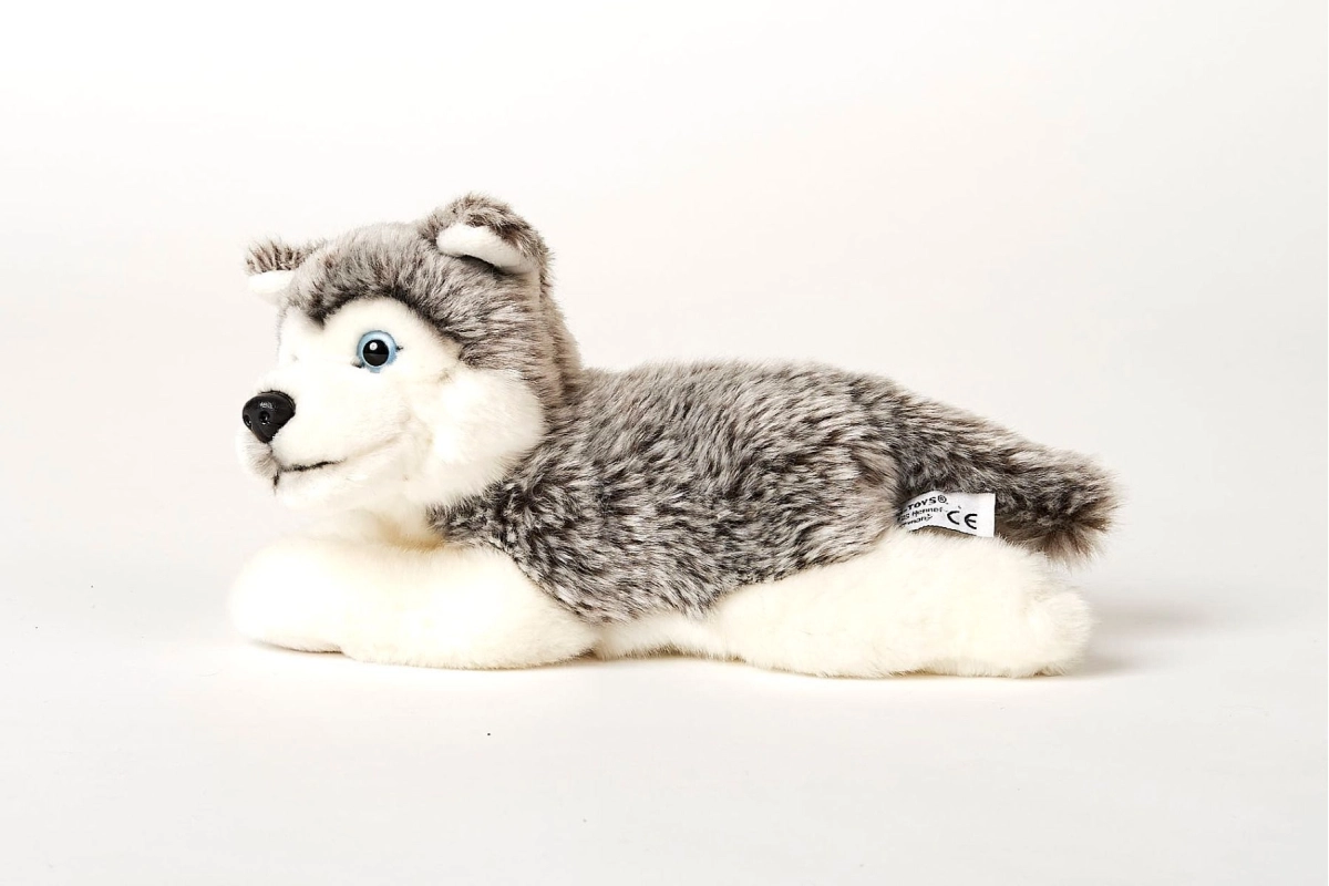 Adorable husky de peluche en posición tumbada de 23 cm que alegrará a pequeños y mayores amantes de los animales. Está hecho de un material agradable y es apto desde 0+. Este peluche eco friendly es ideal para acurrucarse, jugar e incluso como decoración para la habitación infantil.