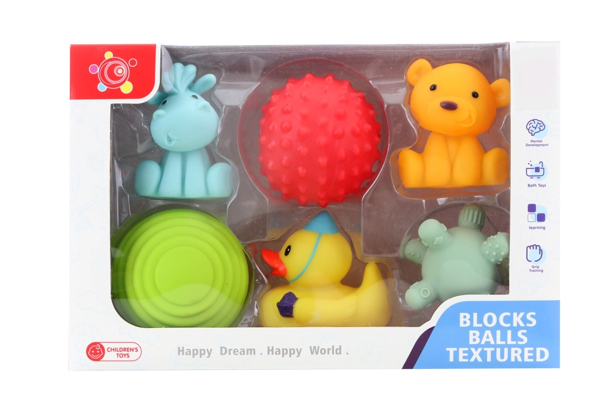 - 6 juguetes de goma (3 con formas + 3 con motivos de animales)