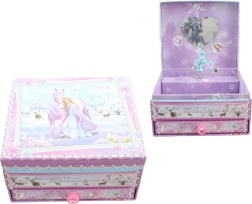 Esta mágica caja de música para joyas con motivo de unicornio encantará a toda amante de los pequeños tesoros. Al dar cuerda y abrir la tapa, la figurita comienza a girar y suena una melodía agradable. En el interior encontrarás un espejo, práctico para probarse las joyas, y en la parte inferior un cajón extraíble para anillos, pulseras y otras cositas. Sus dimensiones compactas de aprox. 16 × 14 × 9 cm y los delicados motivos de cuento la convierten en un bonito complemento para la habitación infantil y una gran idea de regalo.