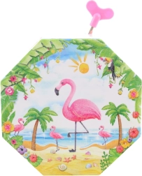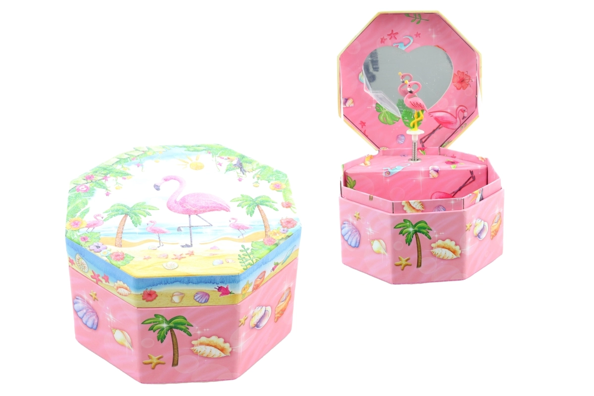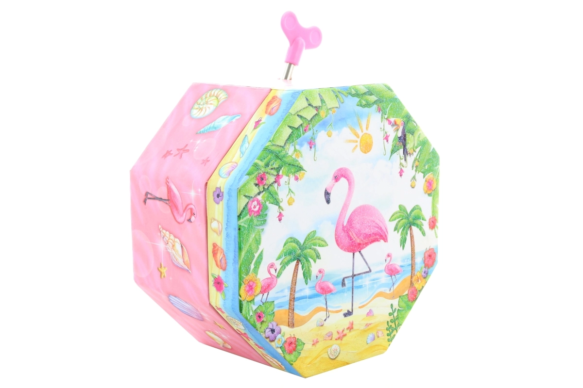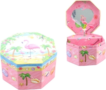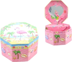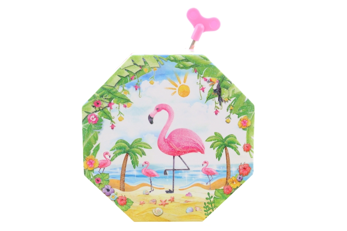 Esta encantadora caja musical para joyas en color rosa destaca por su forma octogonal y su motivo tropical con flamenco, palmeras y conchas. Al abrirla aparece un flamenco danzante frente a un espejito en forma de corazón, que gira tras darle cuerda y acompaña el guardado de las joyas con una melodía agradable.