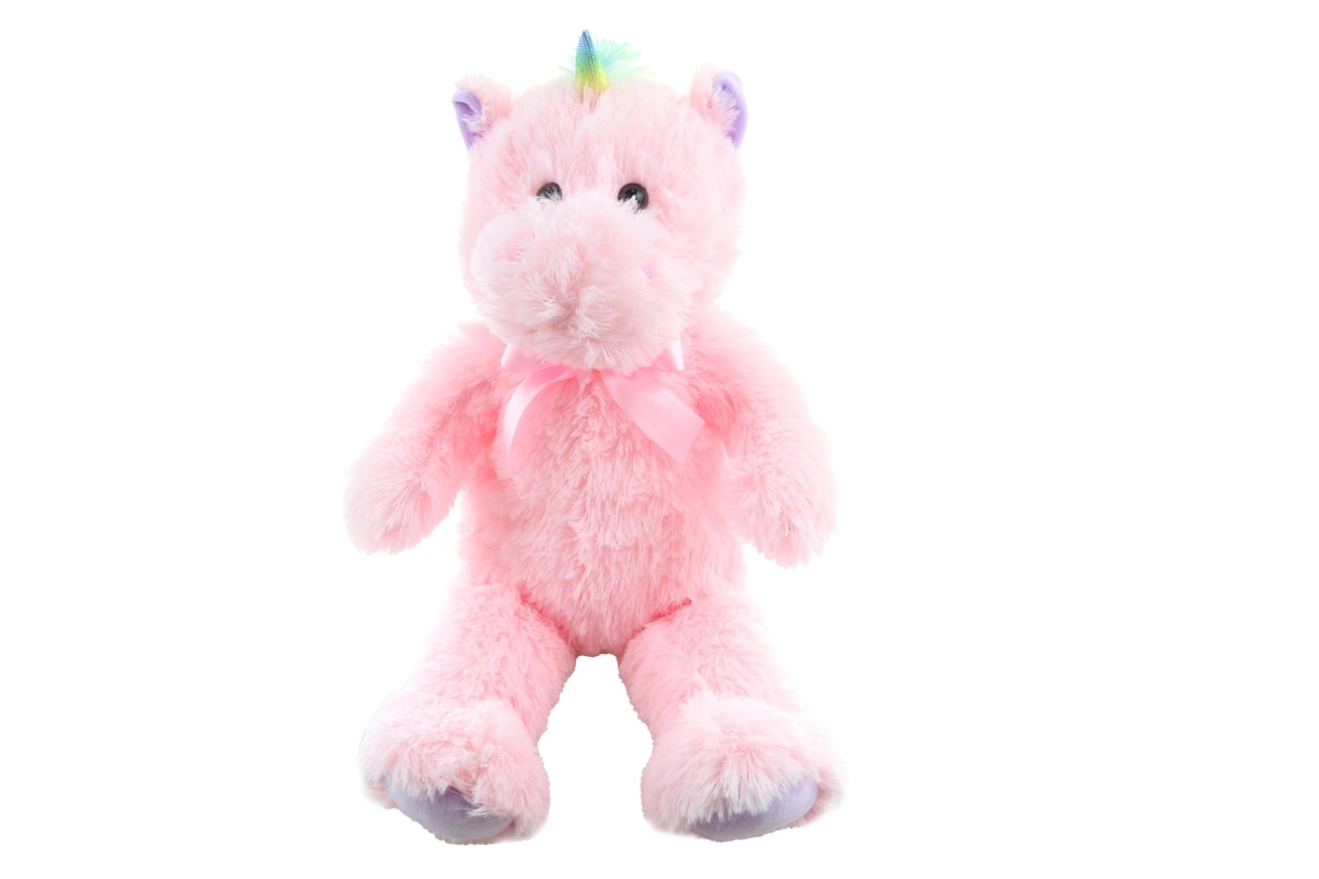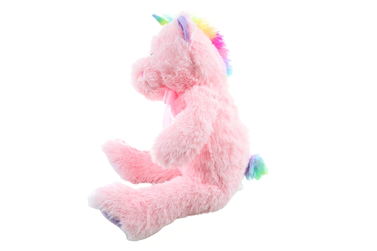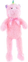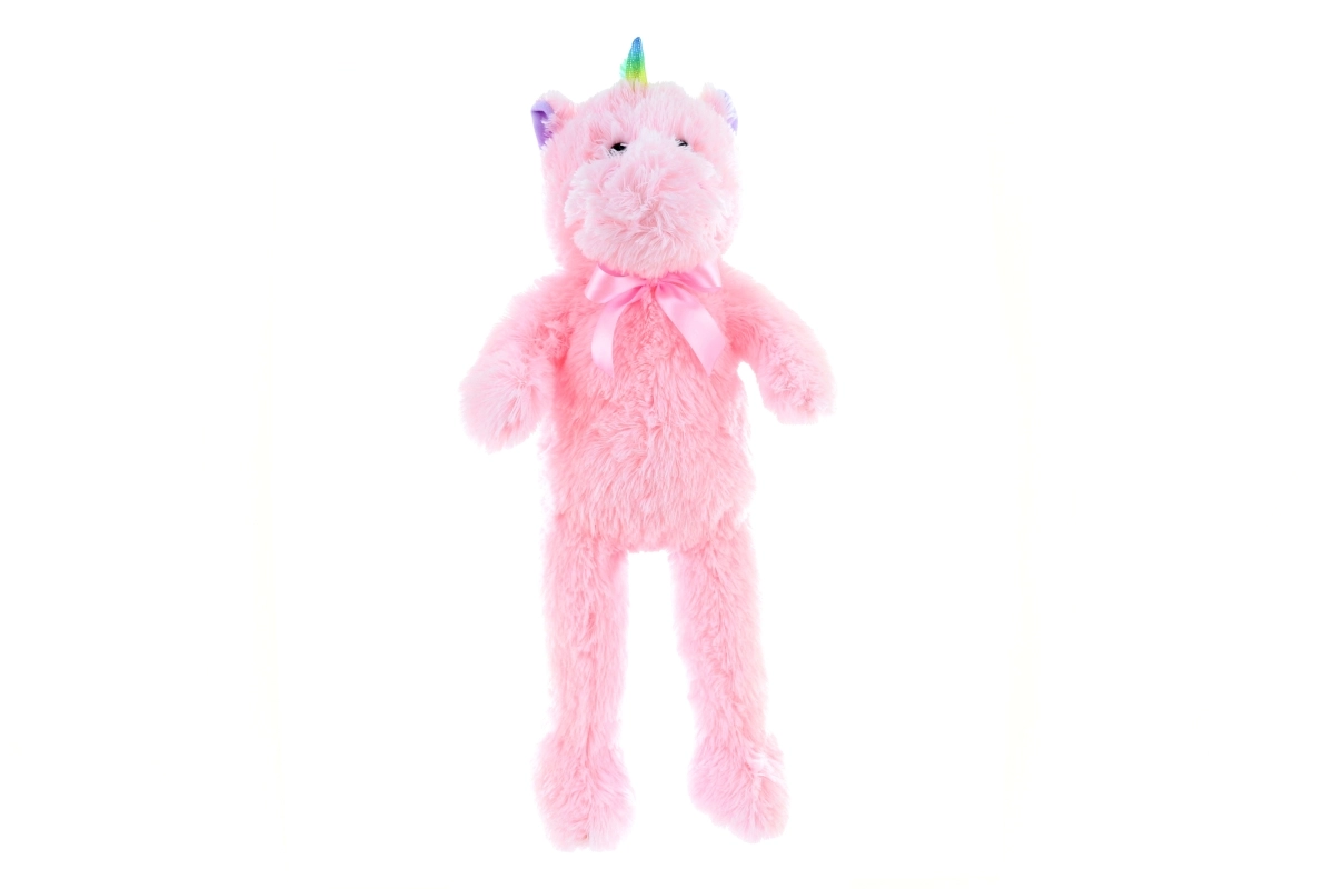 Adorable unicornio de peluche de 55 cm con suave y mullido pelaje, cuerno de colores y lacito en el cuello. Ideal para abrazar, como decoración del dormitorio infantil y para juegos de fantasía. Apto desde 0+.