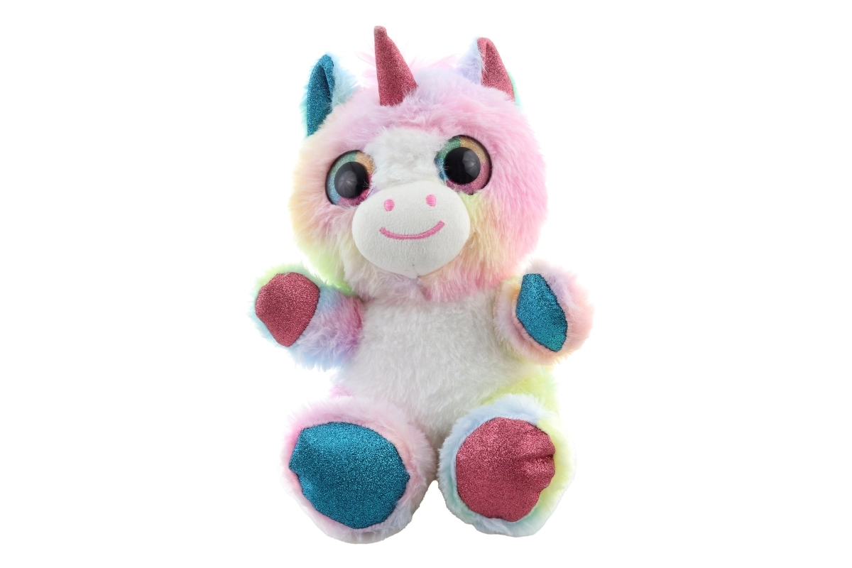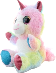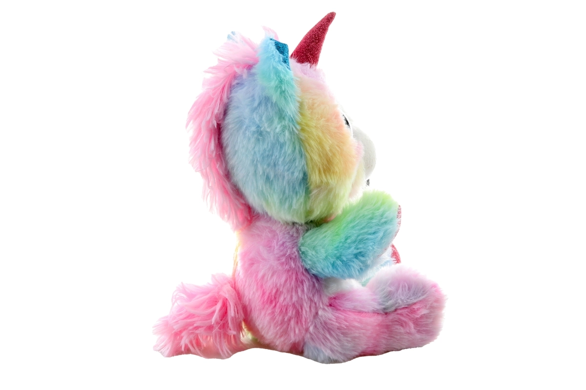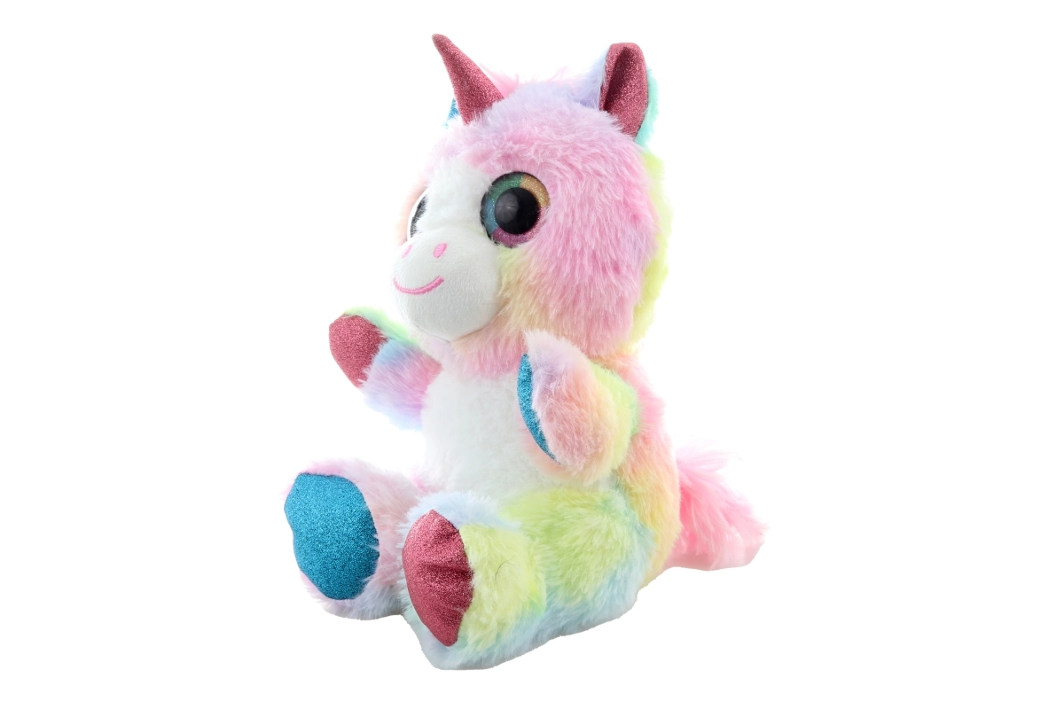 Este colorido unicornio de peluche conquistará el corazón de los niños con su superficie suave y su aspecto mágico. Los tonos pastel arcoíris, los detalles brillantes en el cuerno, las orejas y las pezuñas, y los grandes ojitos bordados lo convierten en un compañero ideal tanto para jugar como para dormir.