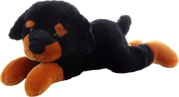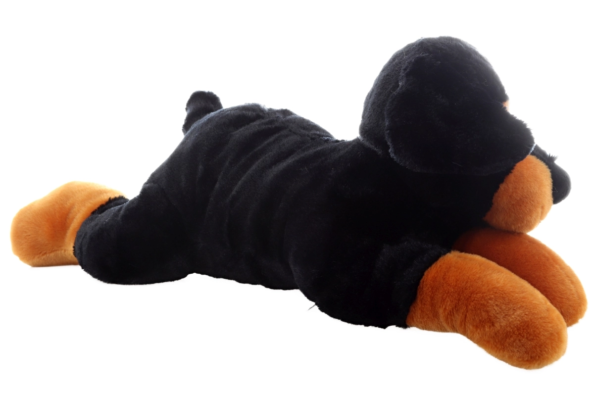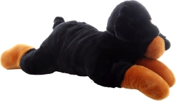 Este perro de peluche en un diseño de colores realista, con pelaje negro y patitas y hocico marrones, está listo para infinitos mimos. Gracias a su superficie suave y al relleno de calidad, es agradable al tacto y se adapta perfectamente al abrazo del niño.