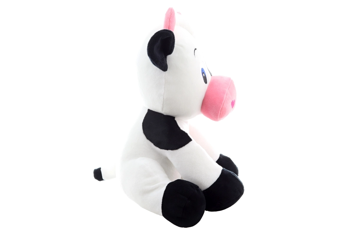 Gracias a sus patitas suaves y bien rellenas, la vaquita se sienta de maravilla y también es una dulce decoración.