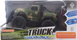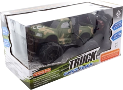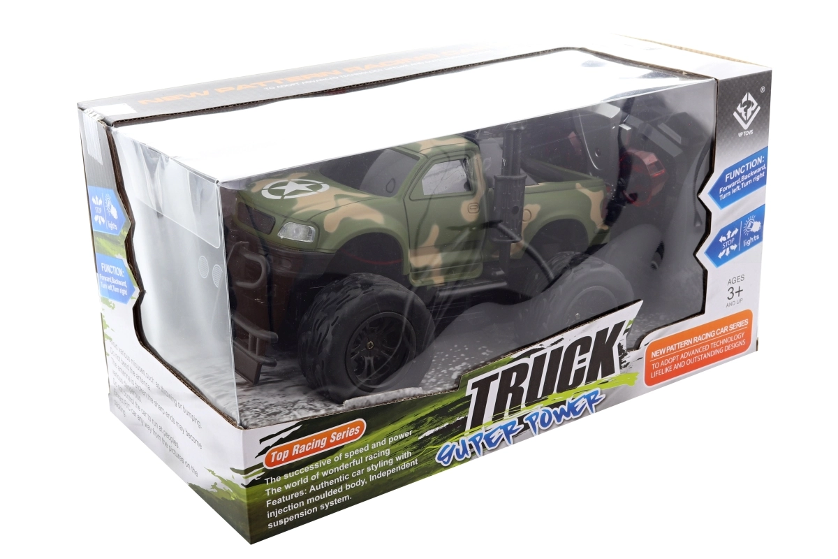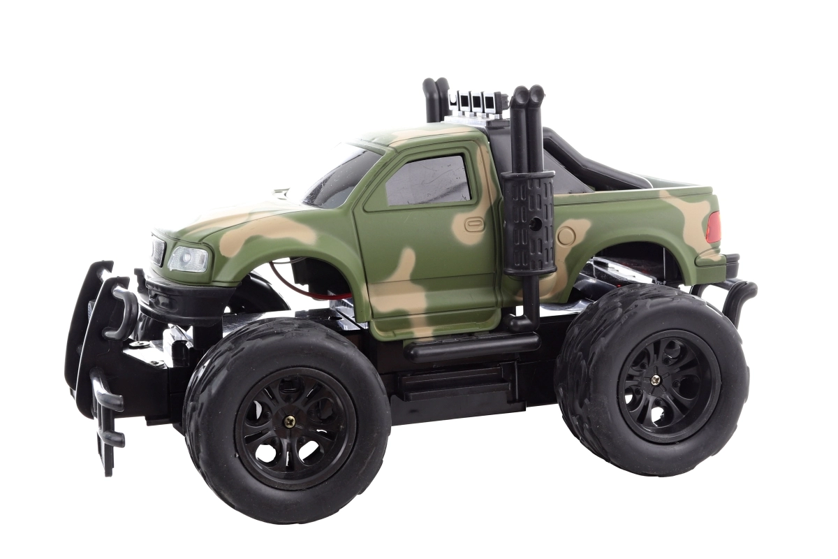 Carrocería robusta en verde camuflaje, suspensión elevada y neumáticos gigantes para circular fácilmente sobre pequeñas irregularidades y alfombras.