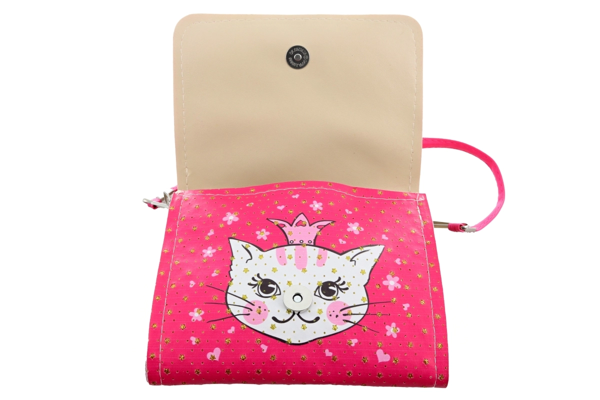 El espacio interior está inteligentemente dividido en 2 compartimentos, para que el niño organice fácilmente pequeños objetos como pañuelos, juguetes pequeños o tesoros de excursiones. El cierre con broche a presión permite un cierre rápido y seguro para que el contenido se mantenga en su sitio. El color intenso y el adorable motivo de gatita llaman la atención a primera vista y fomentan la alegría de llevarlo.