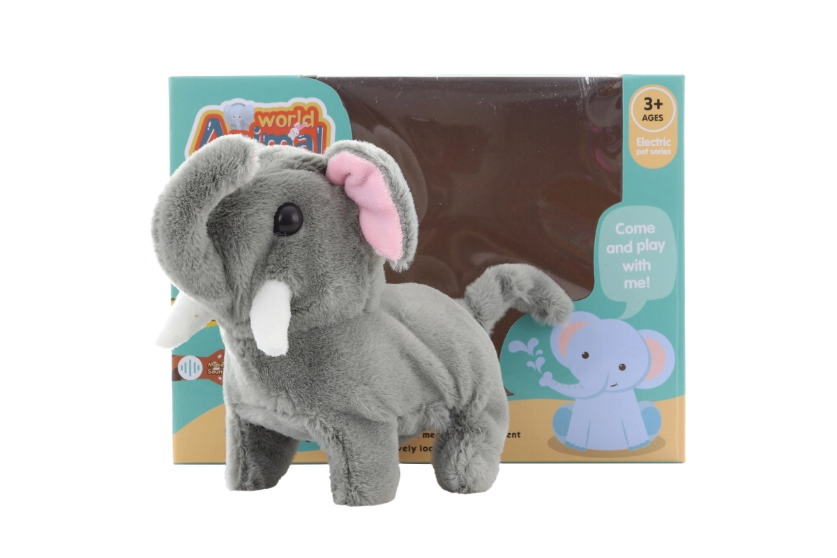 Al encenderlo, este elefante de peluche caminante se mueve de forma encantadora y emite sonidos que sacarán una sonrisa a los niños. La combinación de estructura de plástico y suave superficie de peluche garantiza resistencia y una sensación agradable al jugar.