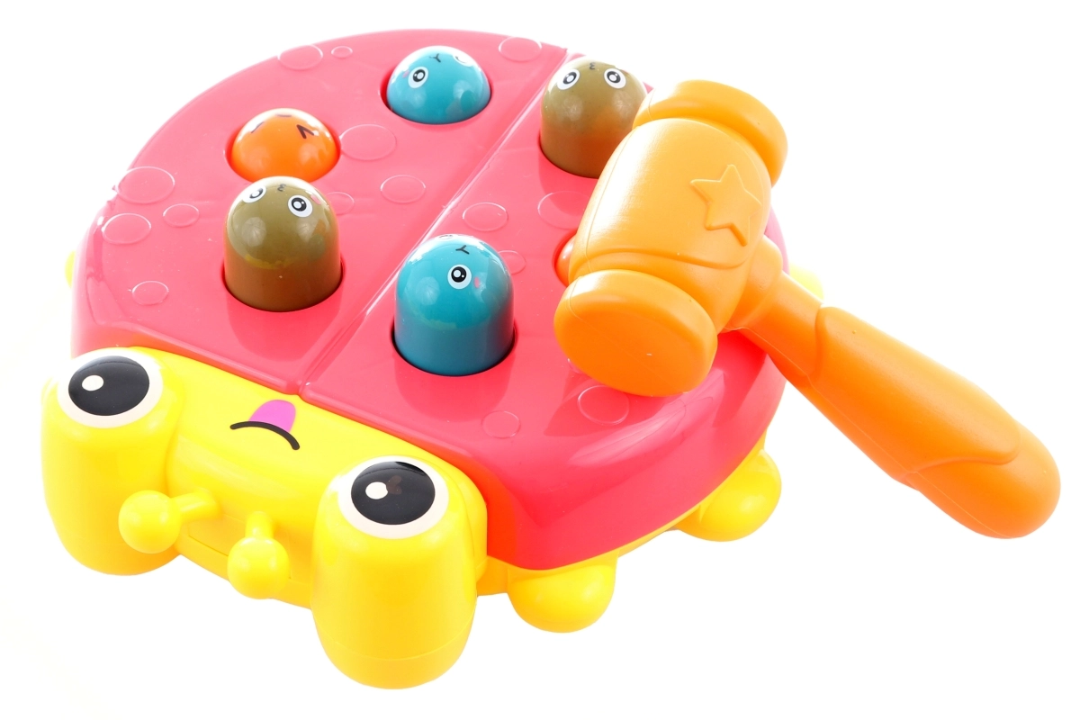 Juguete divertido y seguro para los más pequeños: martillito con forma de mariquita. Fomenta la motricidad fina, la coordinación ojo-mano y enseña el principio de causa y efecto: al golpear una cabecita, aparece otra. Fabricación en plástico resistente y embalaje práctico en caja.