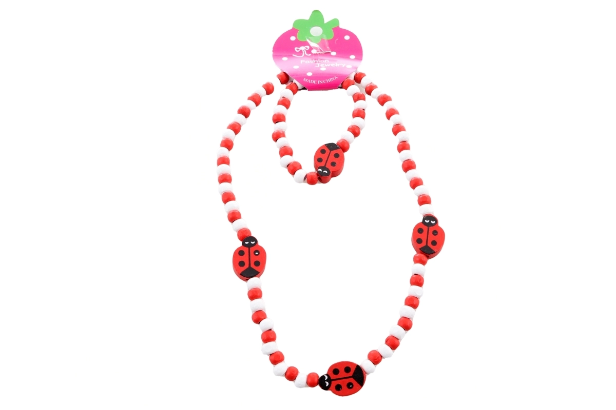 Encantador juego de accesorios para pequeñas coquetas con motivo de mariquitas. Incluye un collar y una pulsera de cuentas de madera ensartadas en una goma elástica, gracias a la cual son cómodos y adaptables. Ideal para el uso diario y como bonito regalo.
