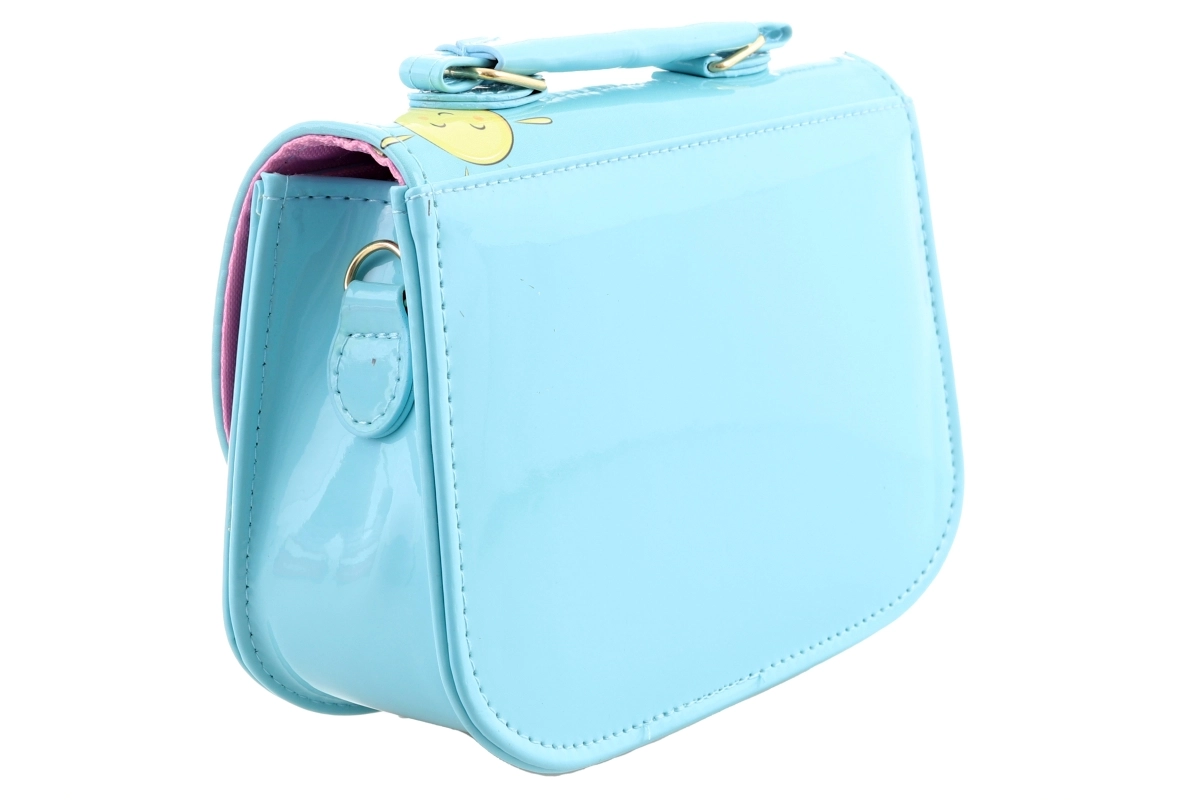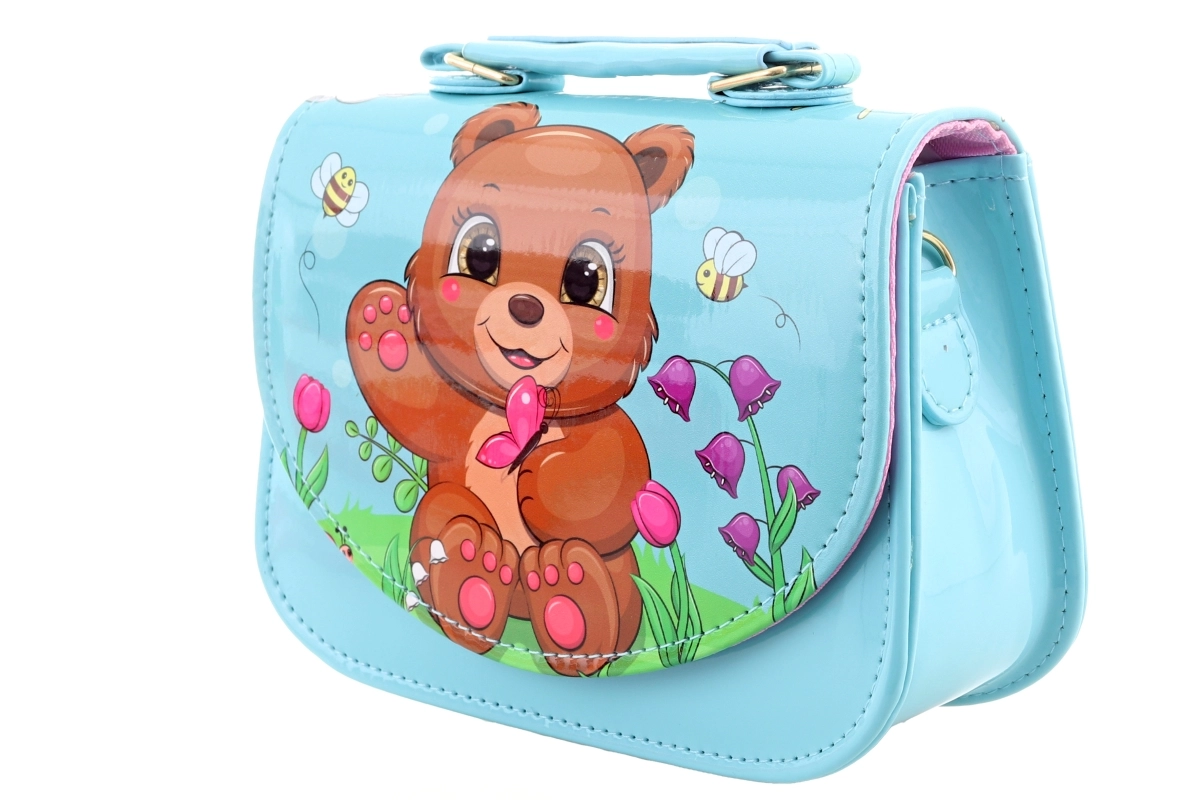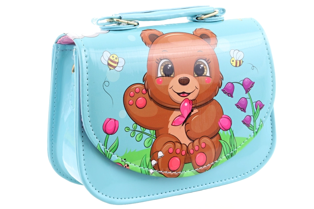 Un adorable bolso infantil en color azul claro con motivo de osito que encantará a las pequeñas amantes de la moda. Tiene superficie brillante y fácil de limpiar, cierre práctico a presión y un único compartimento principal para pequeños objetos. Sus dimensiones compactas de 18 × 14 × 7 cm son ideales para pañuelos, pequeños juguetes o accesorios. El producto no es un juguete.