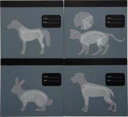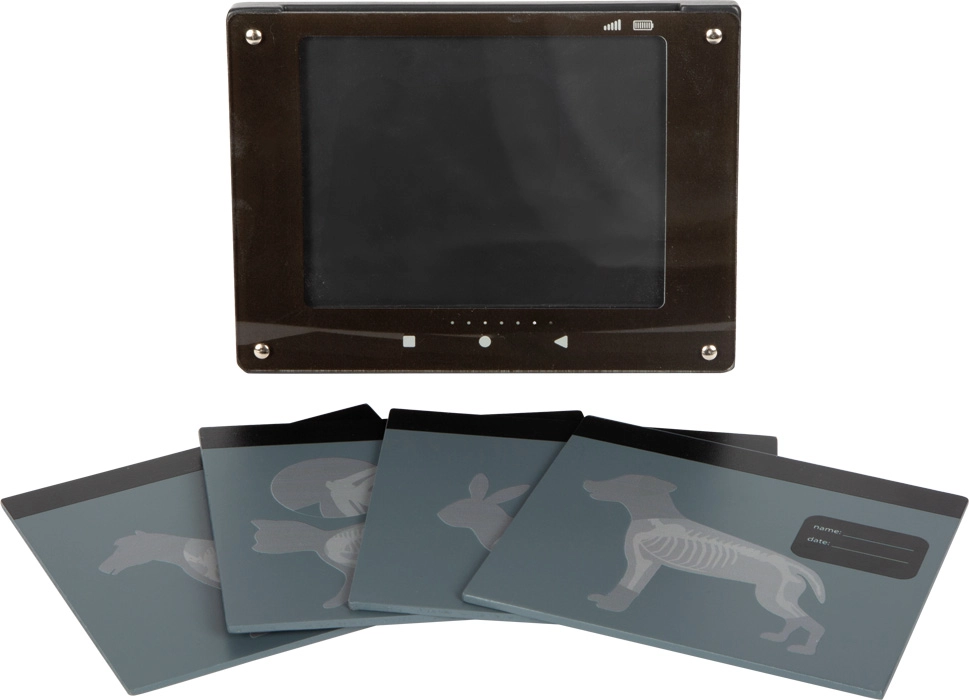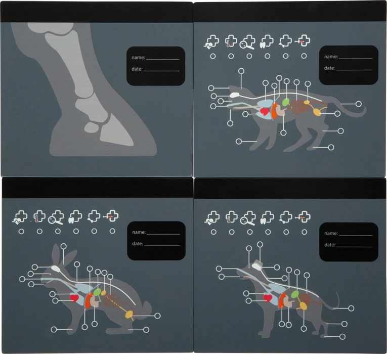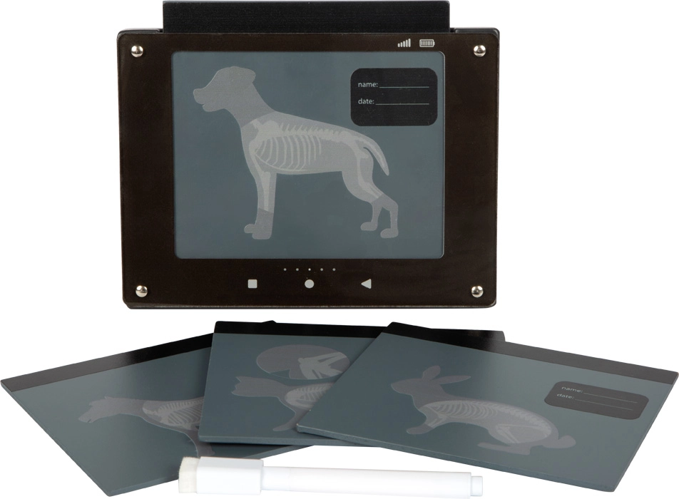 “Rayos X” interactivos con tarjetas transparentes de animales (perro, gato, conejo, caballo) que estimulan la imaginación y explican la anatomía de forma lúdica. El campo para escribir permite añadir el nombre del paciente y la fecha de la revisión.