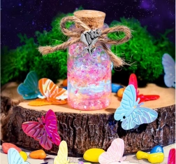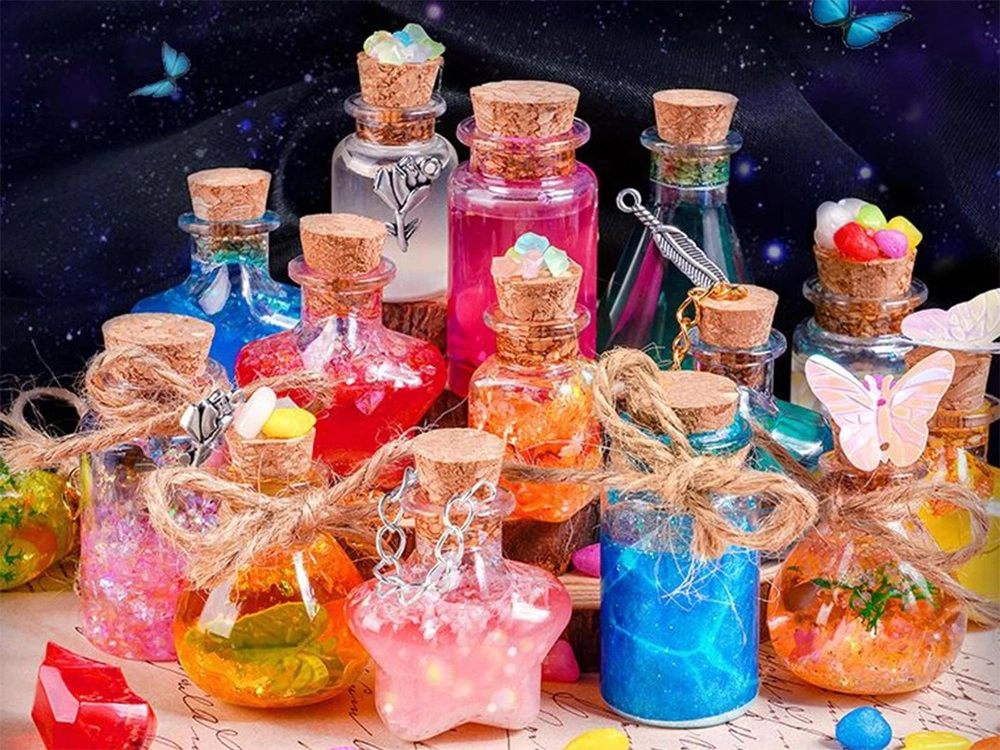El set para crear “elixires mágicos” convierte cualquier idea en una miniobra brillante. Solo hay que verter purpurina y adornos en la botellita, añadir agua con pigmento, cerrar con el corcho y decorar con colgantes. El resultado puede ser un colgante, un talismán o una tierna decoración para la habitación.