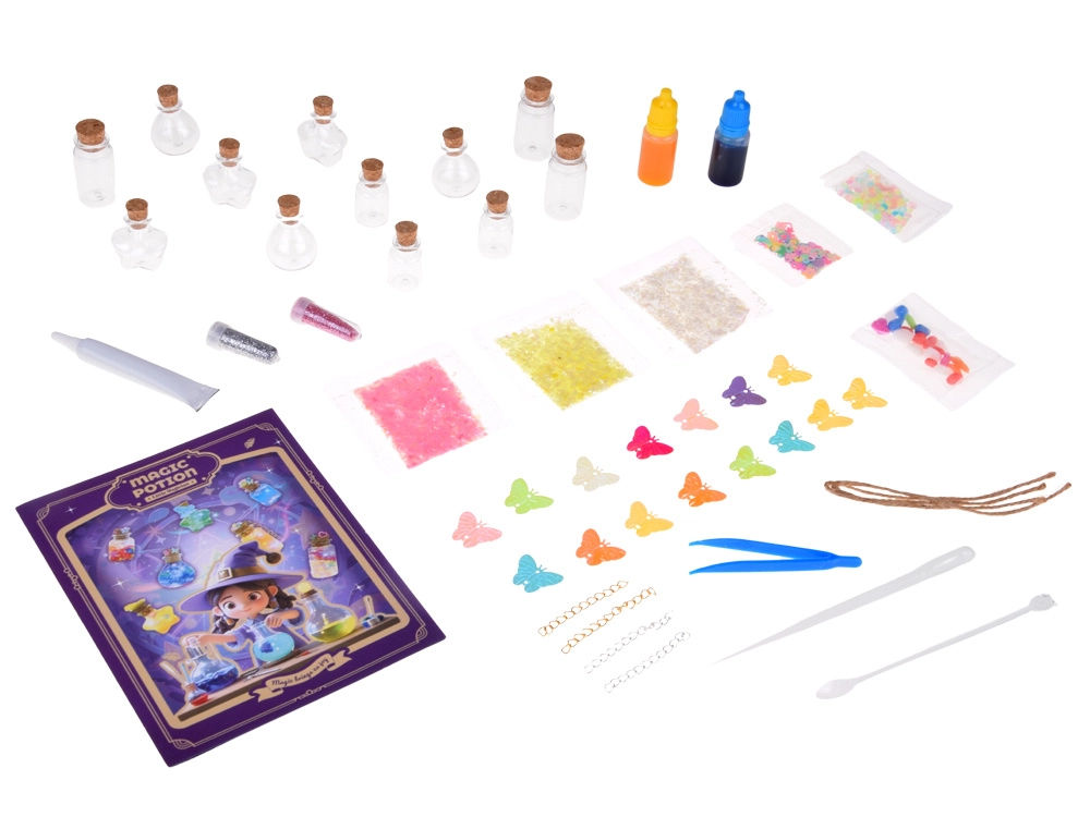 ¡Descubre lo fácil y divertido que es crear tus propios brebajes decorativos! Este set creativo para niños incluye mini botellitas de vidrio con corcho, purpurina, pigmentos, adornos de lentejuelas, colgantes de mariposa y herramientas prácticas para una dosificación precisa. Los niños practicarán la motricidad fina, la creatividad y la imaginación al mezclar colores, rellenar y decorar elixires mágicos.