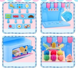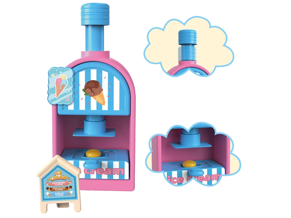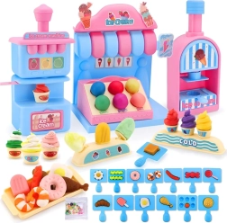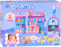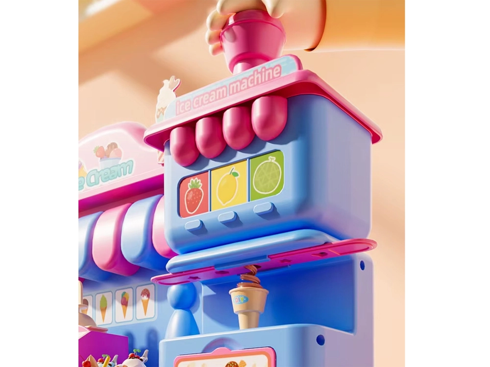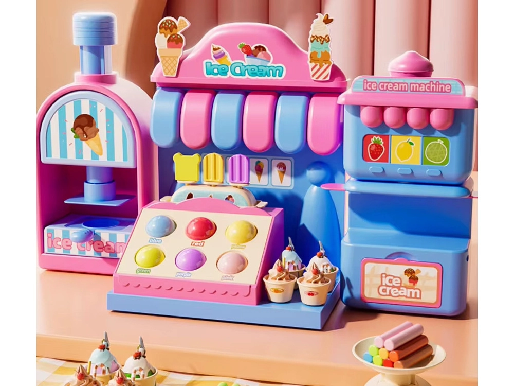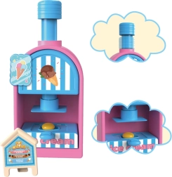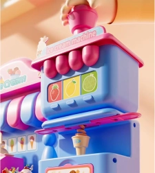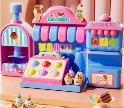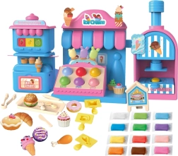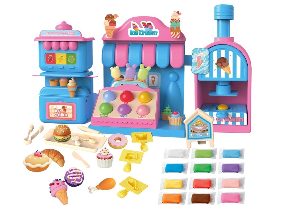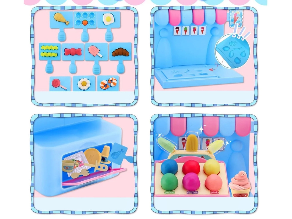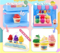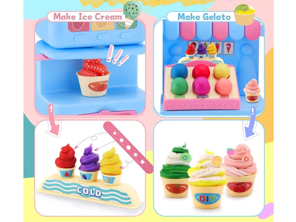 El completo set de juego incluye una máquina de helados para extruir porciones de colores, un mostrador de venta para exponer las delicias y una prensa con molde “horneador” para dar forma a pastelitos y galletas. Todo está armonizado en delicados tonos rosa y azul para que las creaciones luzcan como en una auténtica vitrina de pastelería.
