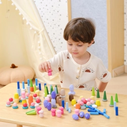 Este set Montessori ofrece un juego libre, sin reglas estrictas. Las piezas que recuerdan a setas, panales, piedritas, conos, anillos o figuritas se pueden combinar, apilar y equilibrar a voluntad. Así, los niños practican el agarre, la coordinación mano-ojo y la capacidad de concentración y resolución independiente.