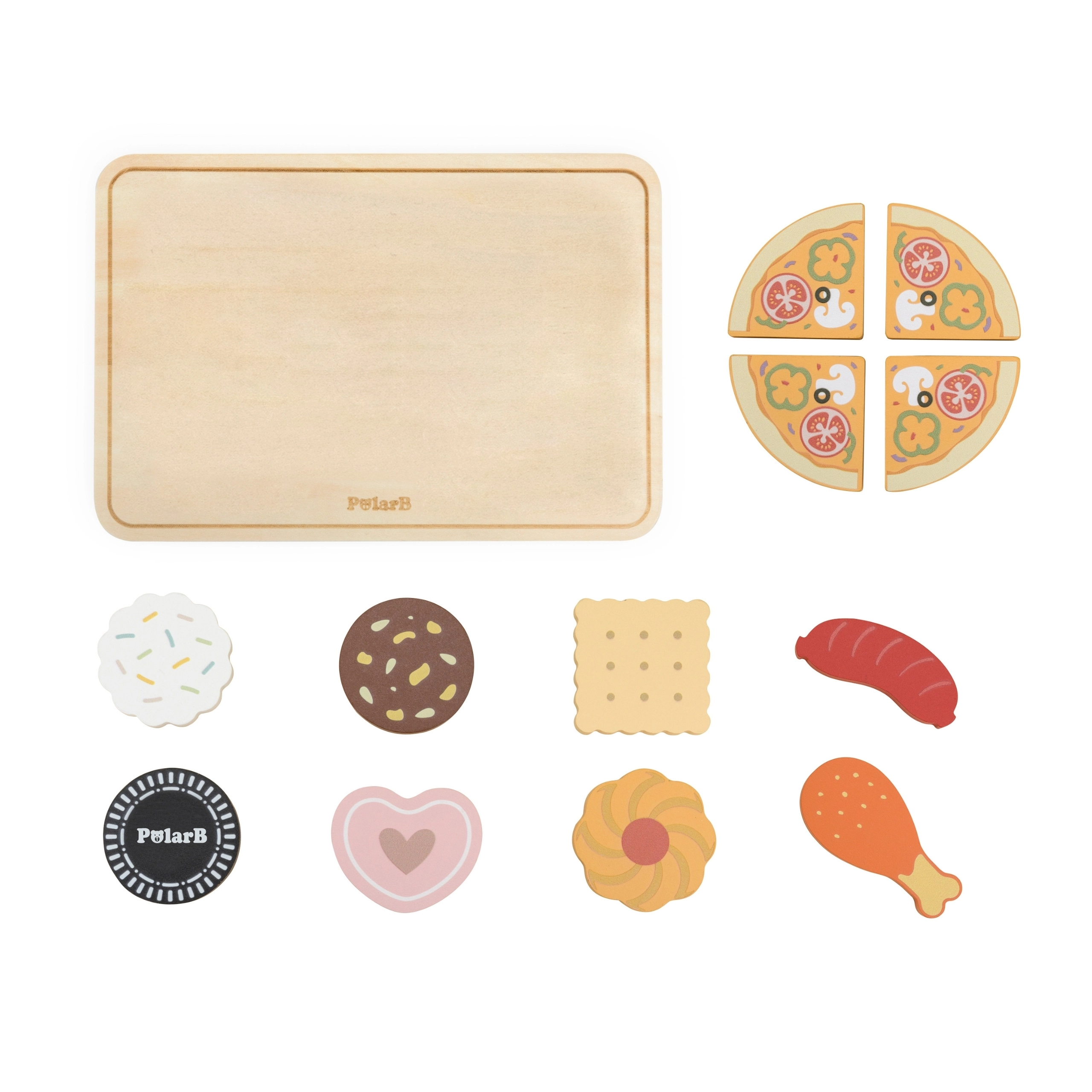 - Accesorios abundantes: 12 alimentos de madera, incluidas galletas, pizza (4 porciones), salchicha y muslo de pollo.