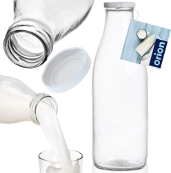 Práctica botella de vidrio de 1 litro con tapa metálica de rosca para un almacenamiento y servido seguros de las bebidas. Gracias al vidrio transparente, su diseño resistente y el cierre fiable, es ideal para leche, zumos, limonadas y cócteles. Apta para el frigorífico, se limpia con facilidad y mantiene las bebidas frescas durante más tiempo.