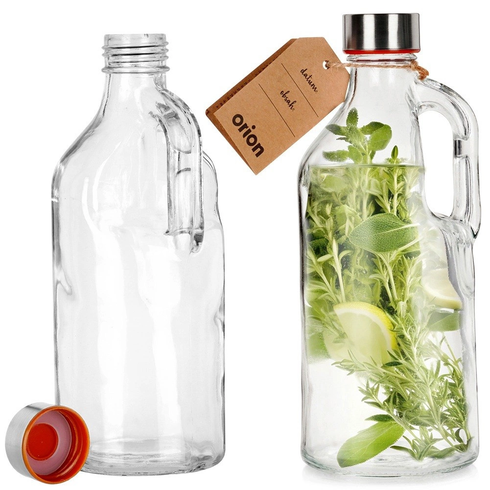Elegante botella de vidrio de 1,15 l con práctica asa y tapa de rosca metálica, ideal para servir bebidas a diario. Ofrece diseño retro, fabricación resistente, junta de silicona para estanqueidad 100% y vertido y transporte cómodos.