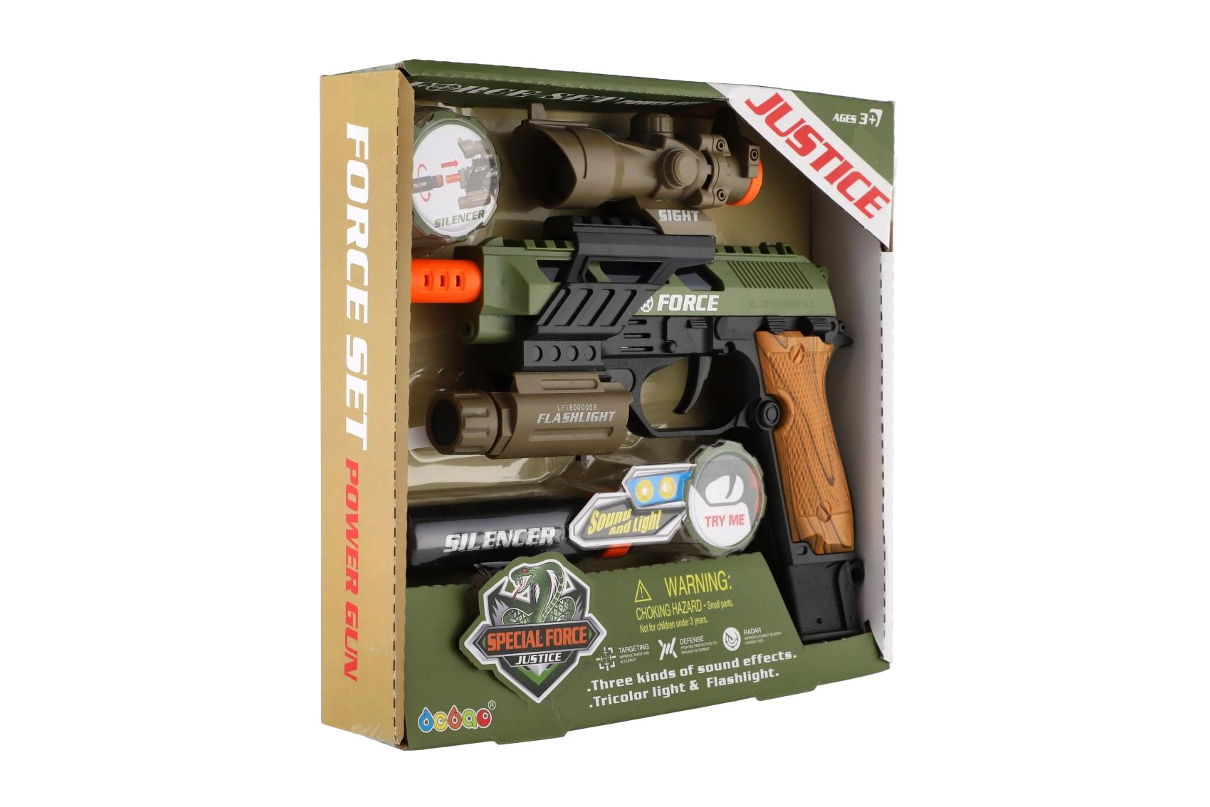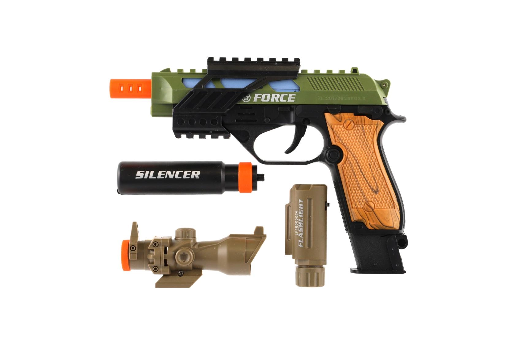 Pistola de plástico con aspecto realista para pequeños aficionados a los juegos de acción. Ofrece efectos de luz, efectos de sonido y prácticos accesorios como mira, linterna y silenciador. Funciona con pilas, que están incluidas en el paquete.