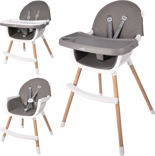 La práctica trona infantil BITEO en elegante color gris ofrece una alimentación segura y cómoda cada día. Dispone de un arnés de seguridad de 5 puntos, bandeja doble desmontable y ajustable en altura, patas ajustables y topes antideslizantes. Las patas de acero con acabado imitación madera complementan el aspecto moderno y proporcionan una estabilidad fiable. El paquete incluye un babero gratis.