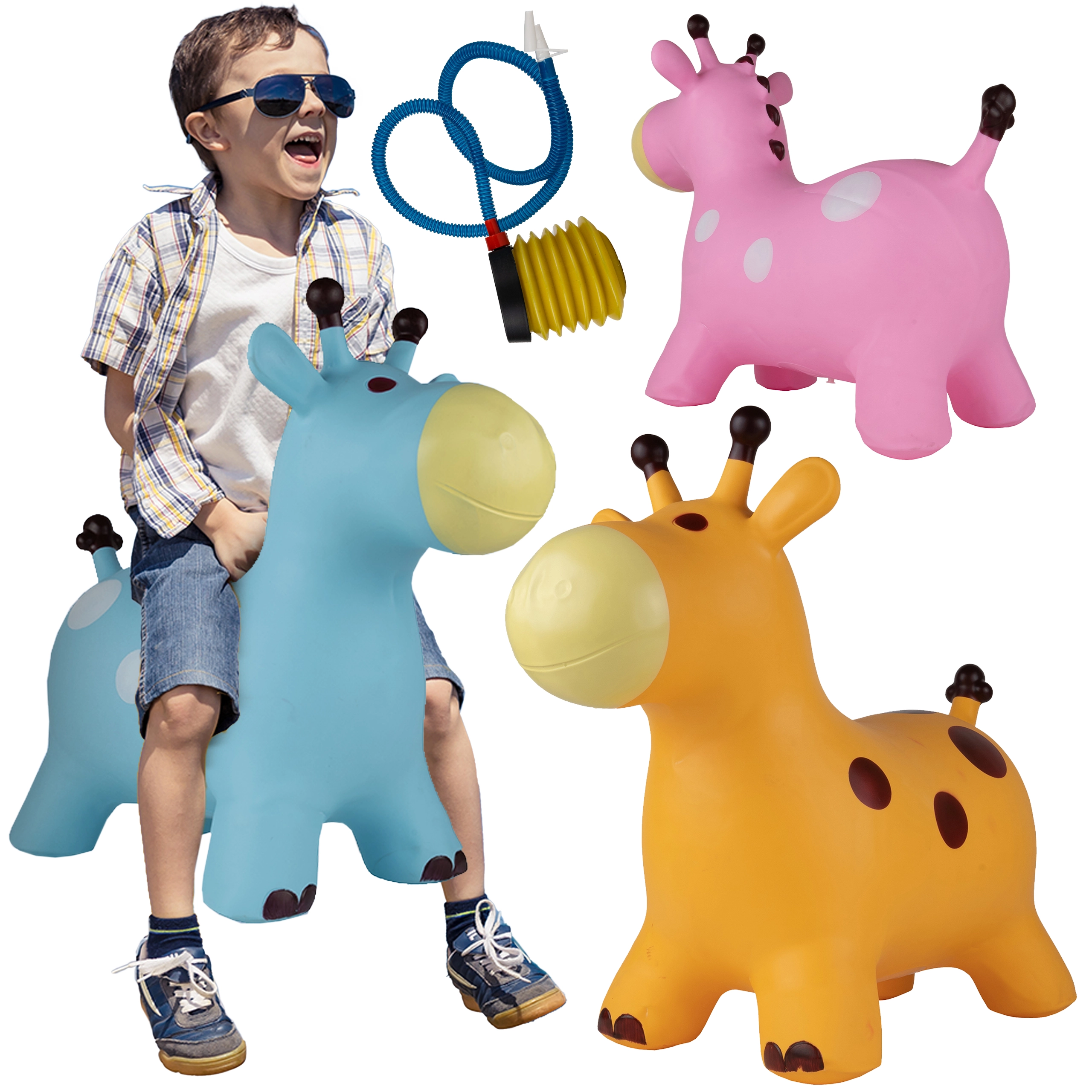 Adorable jirafa saltarina de goma resistente que ofrece a los niños horas de diversión y movimiento activo. La forma estable, el agarre cómodo y la alta capacidad de carga favorecen un juego seguro y el desarrollo de la motricidad. Apto para niños a partir de 3 años. Material resistente, inflado fácil, gran estabilidad y capacidad de carga de hasta 140 kg.