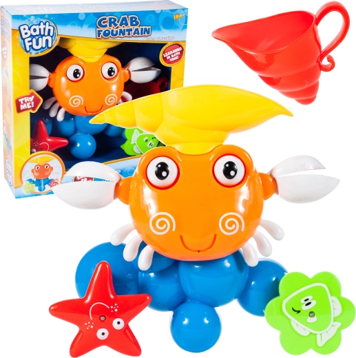 El cangrejo puede colocarse directamente bajo el chorro de agua del grifo o utilizarse con el depósito de agua incluido. El juguete está diseñado para resistir ambientes húmedos y ofrecer diversión durante el baño, el enjuague y el juego con chorros de agua.