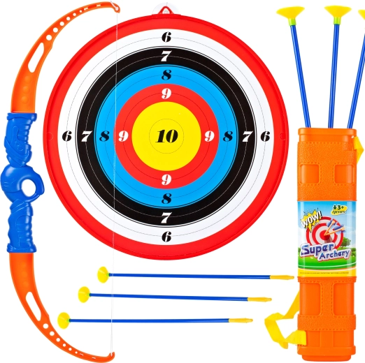 Divertido set infantil para pequeños arqueros que incluye arco de plástico, escudo con diana y accesorios. Ideal para jugar en casa y al aire libre, desarrolla la coordinación, la precisión y la motricidad de los niños.