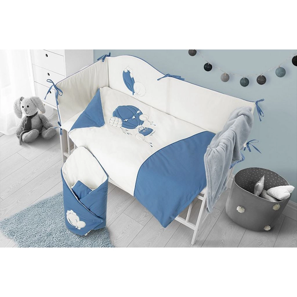 Conjunto de ropa de cama para cuna de 3 piezas de suave algodón 100% con estampado de globos y corona que aporta suavidad, seguridad y un sueño tranquilo. Incluye funda de edredón de 90 × 120 cm, funda de almohada de 40 × 60 cm y protector de cuna de aprox. 180 cm con cintas para una fijación fácil.
