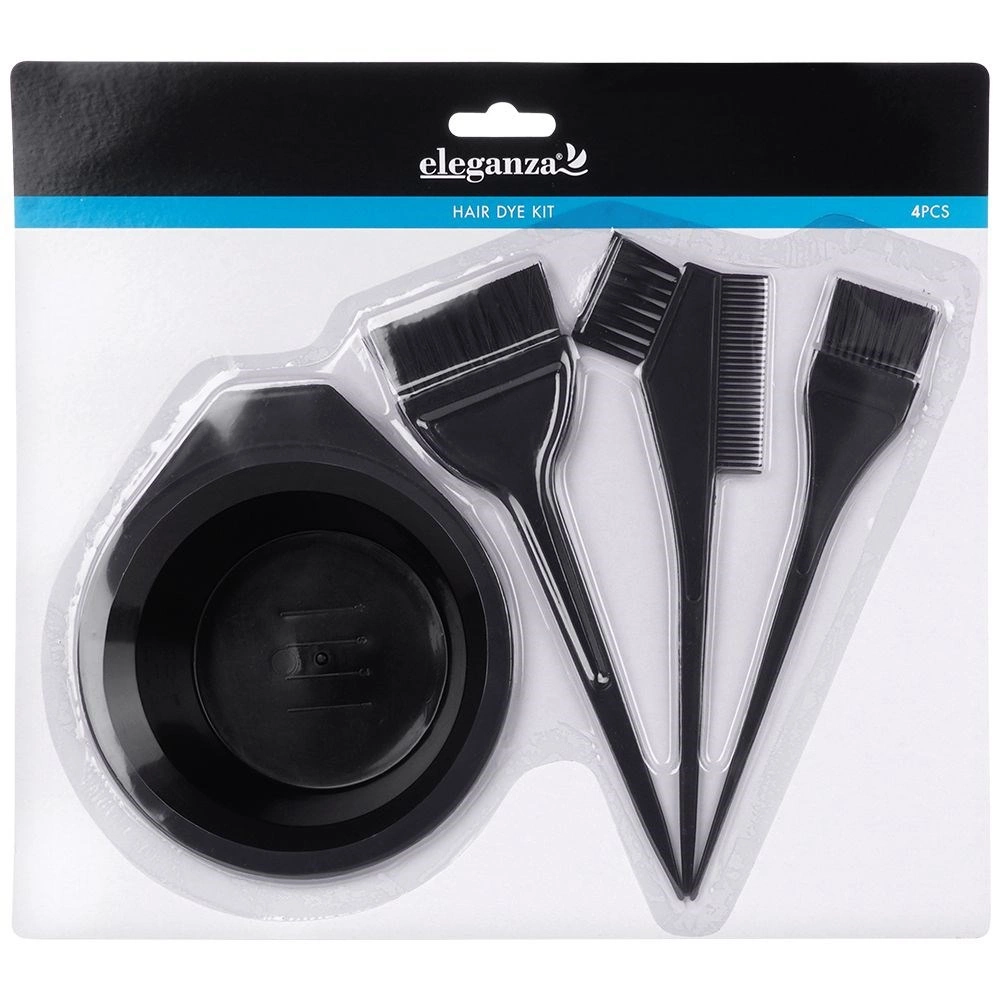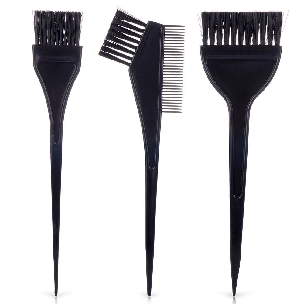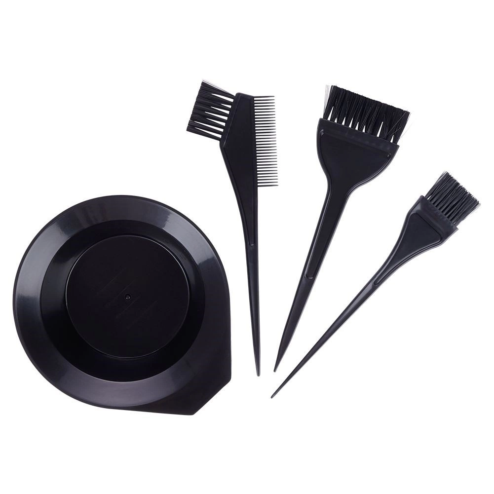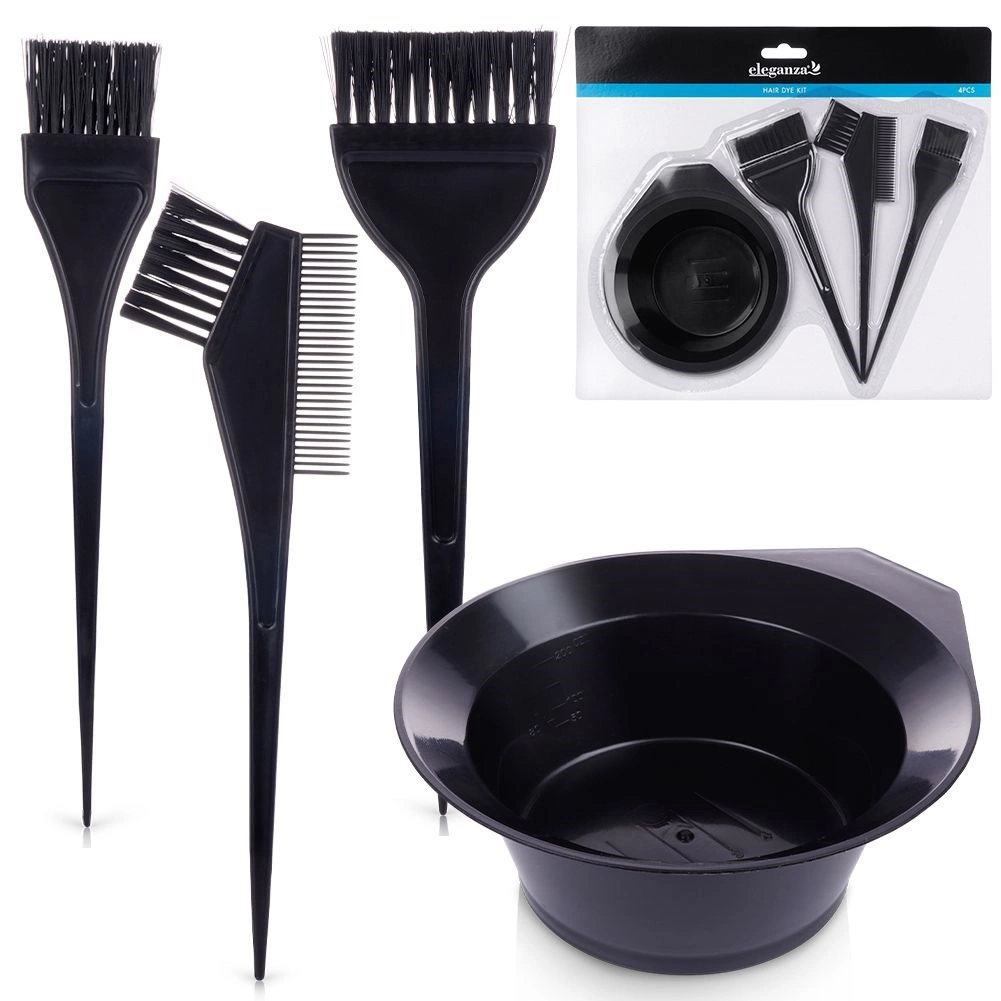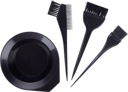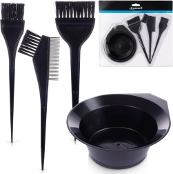 Completo set de coloración de cabello para uso doméstico y profesional: cuenco con medida y tres brochas aplicadoras, incluida brocha con peine. Resistente fabricación en plástico resistente a químicos, mangos puntiagudos para separar mechones con precisión y uso repetido gracias a su fácil limpieza.