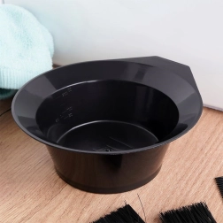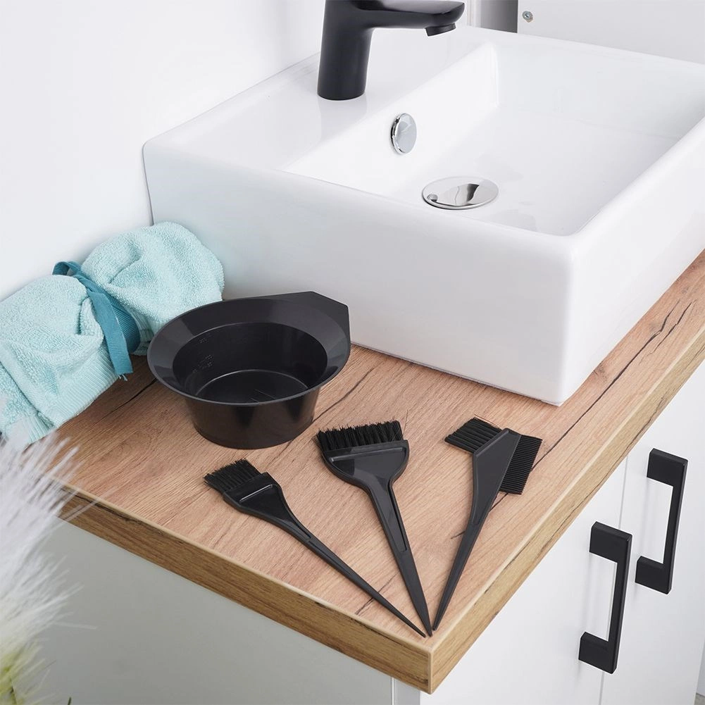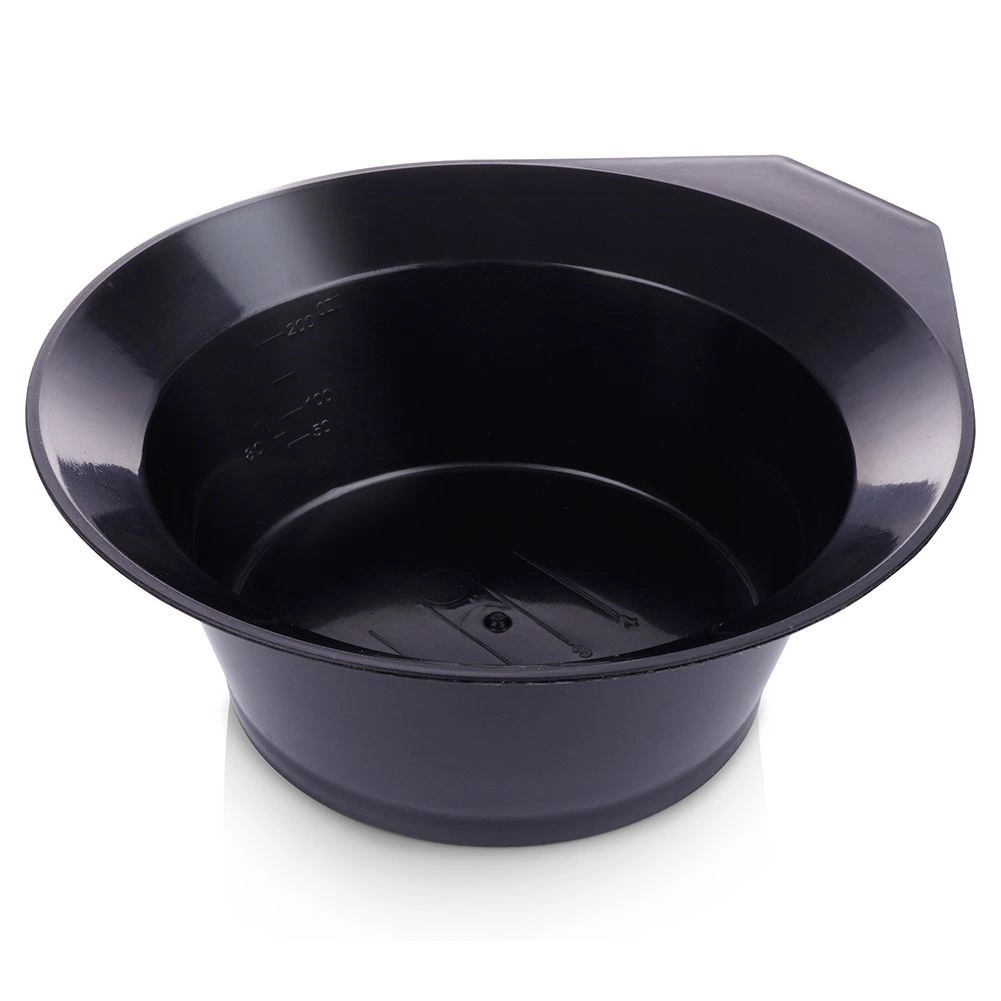 Este práctico set para la coloración del cabello ofrece todo lo necesario para una mezcla precisa y una aplicación uniforme del color. El cuenco con escala marcada (50–200 ml) facilita la dosificación exacta, mientras que las tres brochas de diferentes anchos garantizan una aplicación precisa incluso en zonas de difícil acceso. El plástico negro resistente soporta bien los químicos de peluquería y se limpia fácilmente.