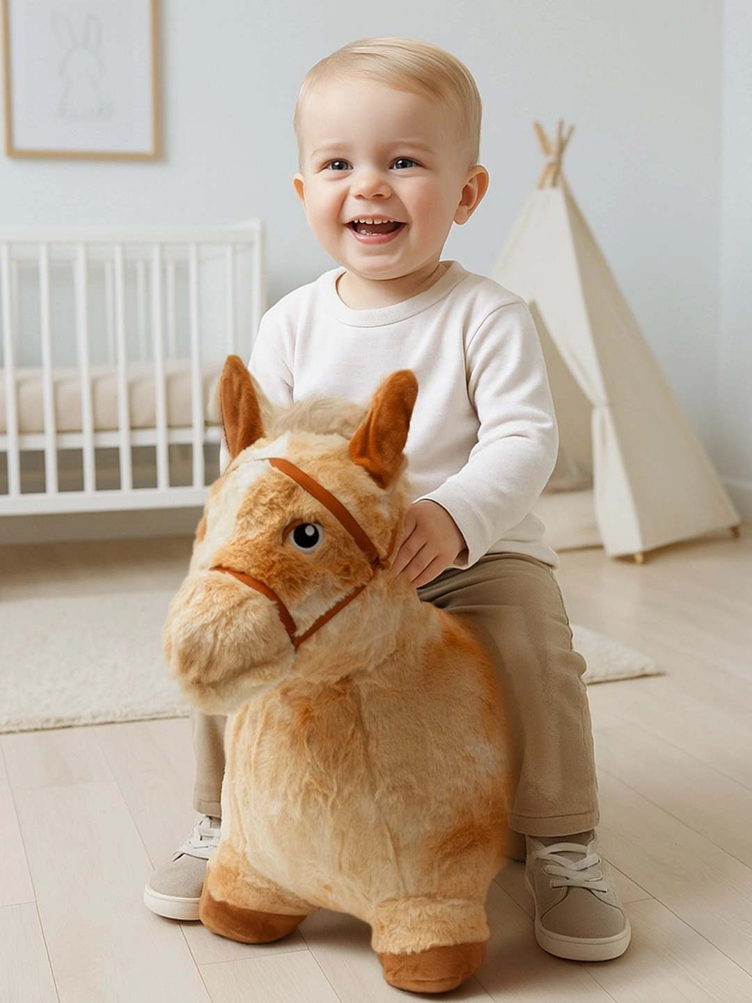 El caballito saltarín de peluche PLAYTO combina diversión, movimiento y seguridad. El cuerpo inflable está cubierto con un peluche suave y agradable que garantiza un agarre cómodo y estabilidad durante el juego. Al presionar las orejas, el caballito emite sonidos realistas que estimulan la imaginación y prolongan la diversión.