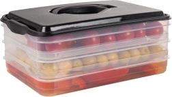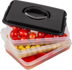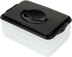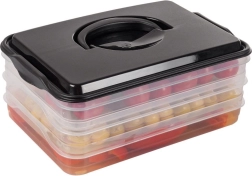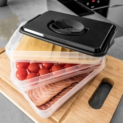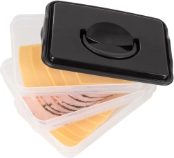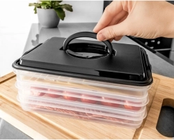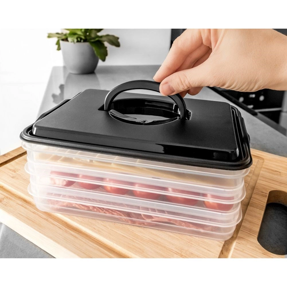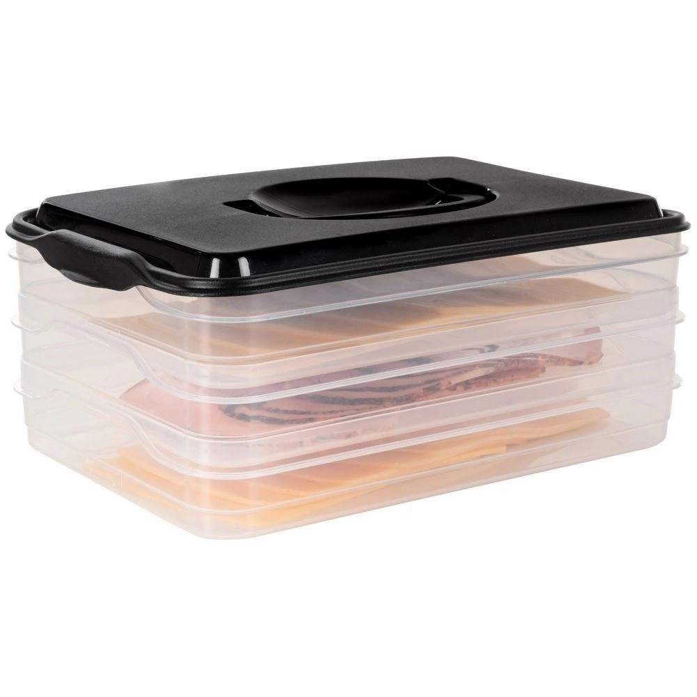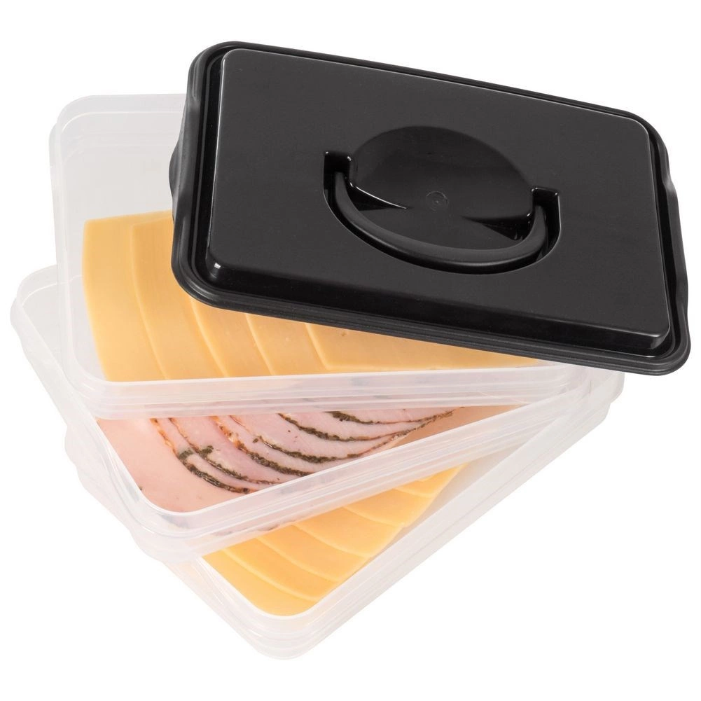 Este organizador inteligente de alimentos ofrece tres niveles separables y transparentes para almacenar cómodamente quesos en lonchas, embutidos y pequeños ingredientes sin mezclar olores. Su forma rectangular compacta encaja perfectamente en las baldas del frigorífico y la sólida tapa negra con asa garantiza una manipulación sencilla.
