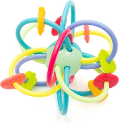 Este mordedor multifuncional con un suave sonajero aporta alivio durante la erupción dental y, al mismo tiempo, entretiene los sentidos. Las partes blandas masajean las encías, mientras que el sonajero estimula el oído y ayuda a desarrollar la coordinación mano-ojo. Gracias a su construcción ligera y su forma cuidadosamente diseñada, el bebé puede sujetarlo fácilmente desde cualquier ángulo.