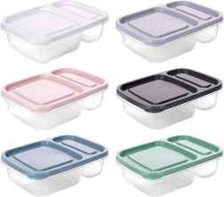 Fiambrera práctica y resistente de 750 ml para llevar el almuerzo al trabajo, la escuela o de viaje. Gracias a sus compartimentos divididos mantiene la comida separada, la tapa firme garantiza la frescura y el cuerpo transparente permite comprobar el contenido de inmediato. Apta para lavavajillas, microondas, nevera y congelador.