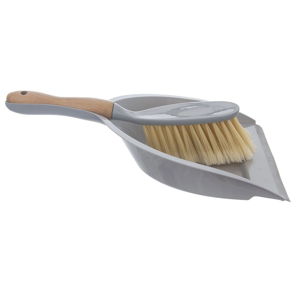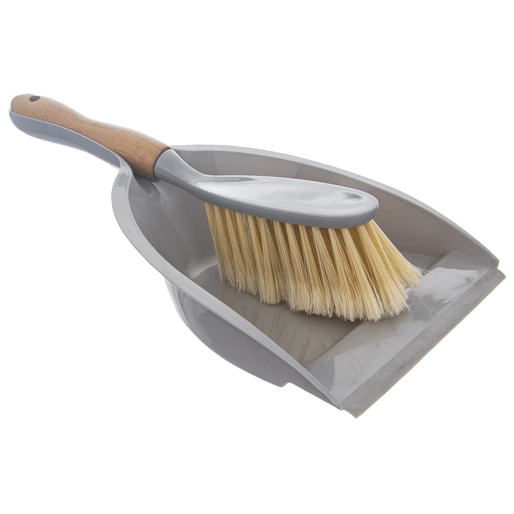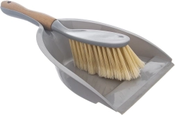 Set elegante y resistente para la limpieza diaria. El recogedor de plástico gris de alta calidad tiene un depósito ancho y profundo y un borde de goma de 1 cm de ancho, que se ajusta perfectamente al suelo y evita la fuga de suciedad. El cepillo con mango de bambú se adapta bien a la mano y sus cerdas densas y suaves recogen eficazmente incluso el polvo fino.