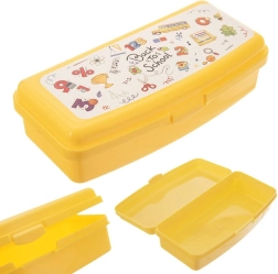 Práctica caja para tentempiés con capacidad de 500 ml en un moderno color amarillo, ideal para canapés, meriendas y pequeños objetos. Cuenta con una tapa de cierre a presión con un solo clip, es ligera, fácil de limpiar y, gracias a su motivo escolar, los niños la reconocerán fácilmente. Adecuada para la escuela, excursiones y viajes.
